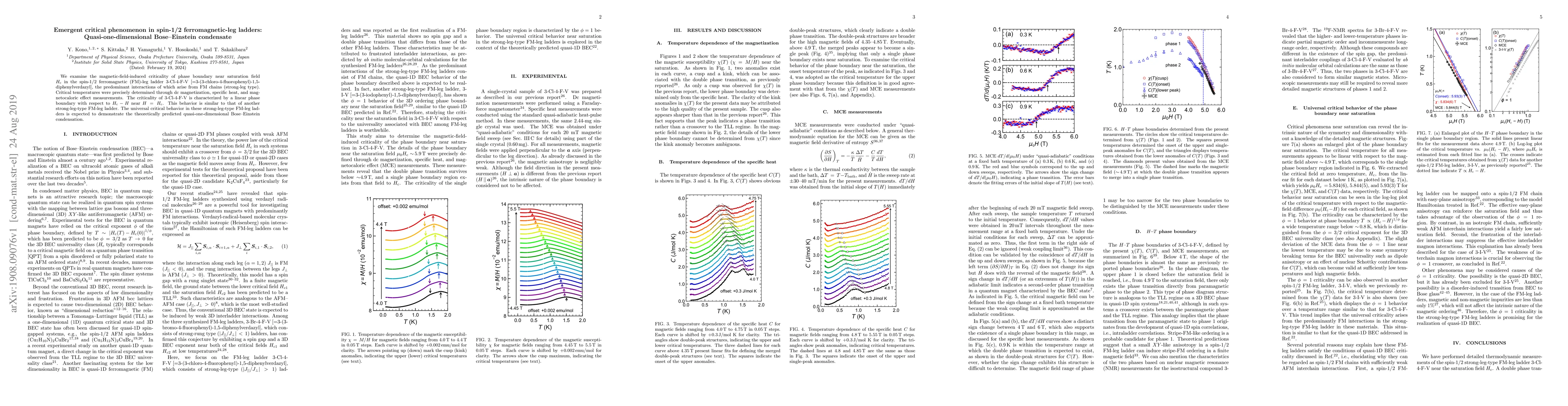 This study investigates the magnetic-field-induced criticality in spin-1/2 ferromagnetic-leg ladders, specifically 3-Cl-4-F-V, revealing a linear phase boundary near the saturation field. The critical behavior suggests a quasi-one-dimensional Bose-Einstein condensation, consistent with theoretical predictions.