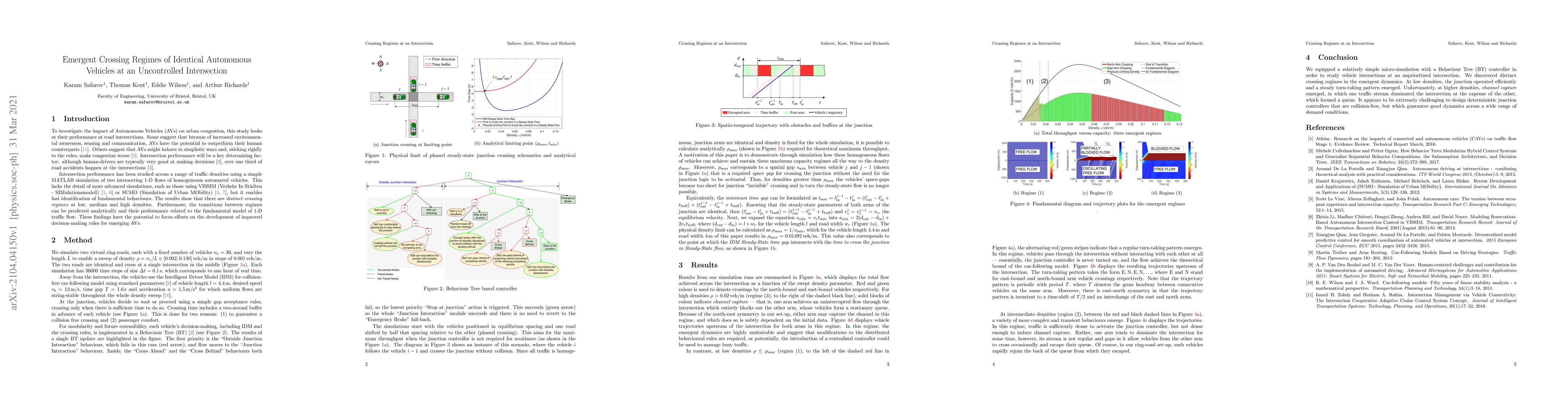 To investigate the impact of Autonomous Vehicles (AVs) on urban congestion, this study looks at their performance at road intersections. Intersection performance has been studied across a range of traffic densities using a simple MATLAB simulation of two intersecting 1-D flows of homogeneous automated vehicles. This lacks the detail of more advanced simulations, but it enables fast identification of fundamental behaviours. The results show that there are distinct crossing regimes at low, medium and high densities. Furthermore, the transitions between regimes can be predicted analytically and their performance related to the fundamental model of 1-D traffic flow. These findings have the potential to focus efforts on the development of improved decision-making rules for emerging AVs.