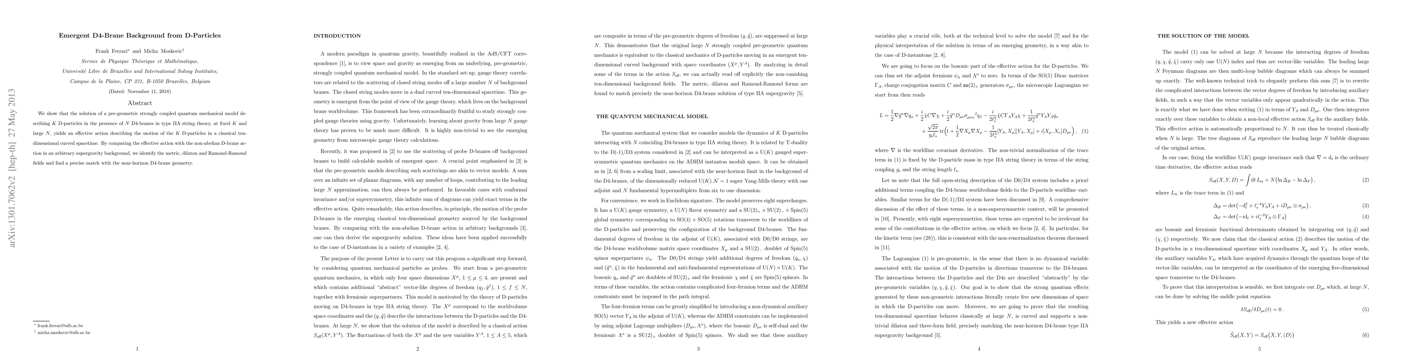 We show that the solution of a pre-geometric strongly coupled quantum mechanical model describing K D-particles in the presence of N D4-branes in type IIA string theory, at fixed K and large N, yields an effective action describing the motion of the K D-particles in a classical ten-dimensional curved space-time. By comparing the effective action with the non-abelian D-brane action in an arbitrary supergravity background, we identify the metric, dilaton and Ramond-Ramond fields and find a precise match with the near-horizon D4-brane geometry.