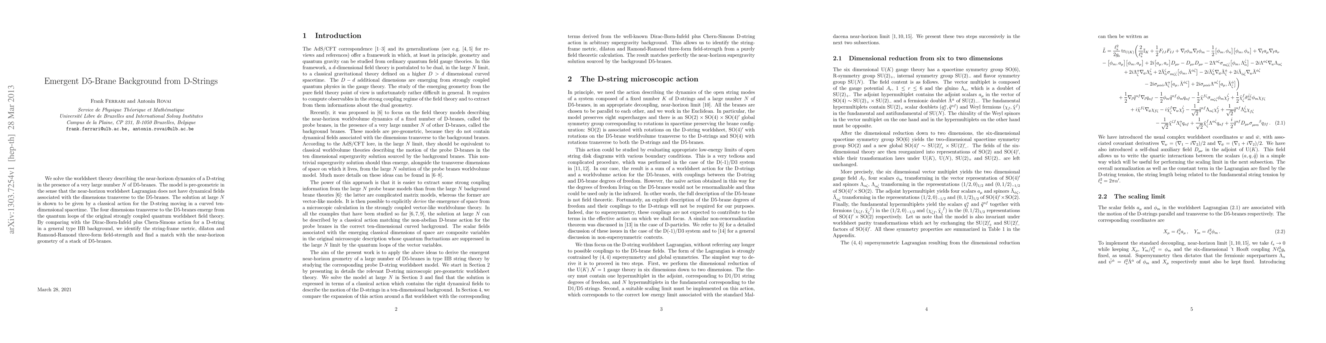 The paper presents a solution for the worldsheet theory of a D-string near D5-branes at large N, describing the emergence of transverse dimensions from quantum loops. The solution matches the near-horizon geometry of a D5-branes stack, identified via comparison with DBI+CS action in a general IIB background.
