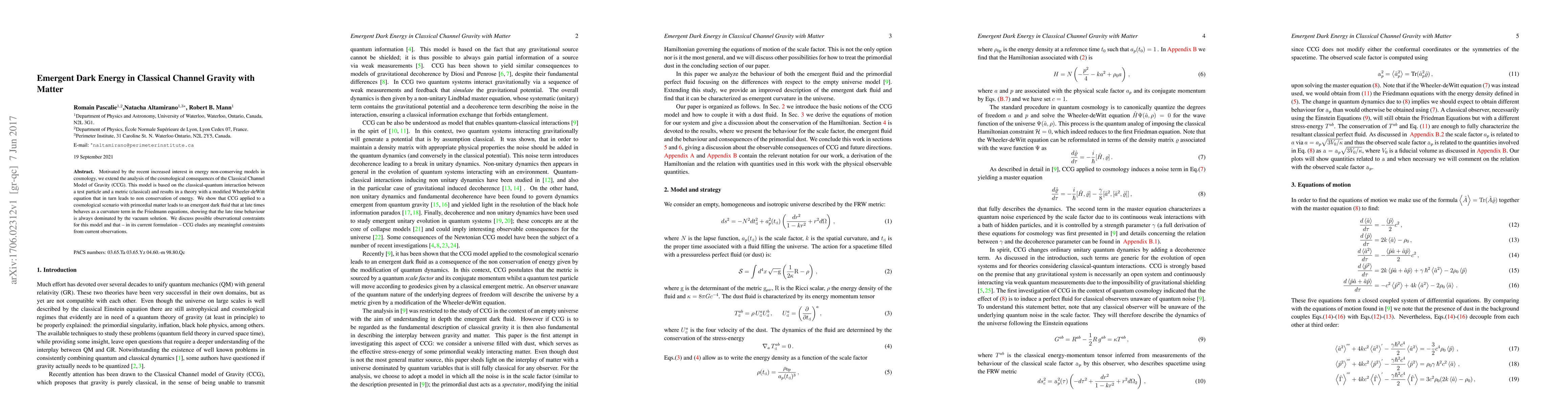 Motivated by the recent increased interest in energy non-conserving models in cosmology, we extend the analysis of the cosmological consequences of the Classical Channel Model of Gravity (CCG). This model is based on the classical-quantum interaction between a test particle and a metric (classical) and results in a theory with a modified Wheeler-deWitt equation that in turn leads to non conservation of energy. We show that CCG applied to a cosmological scenario with primordial matter leads to an emergent dark fluid that at late times behaves as a curvature term in the Friedmann equations, showing that the late time behaviour is always dominated by the vacuum solutions. We discuss possible observational constraints for this model and that, in its current formulation, CCG eludes any meaningful constraints from current observations.