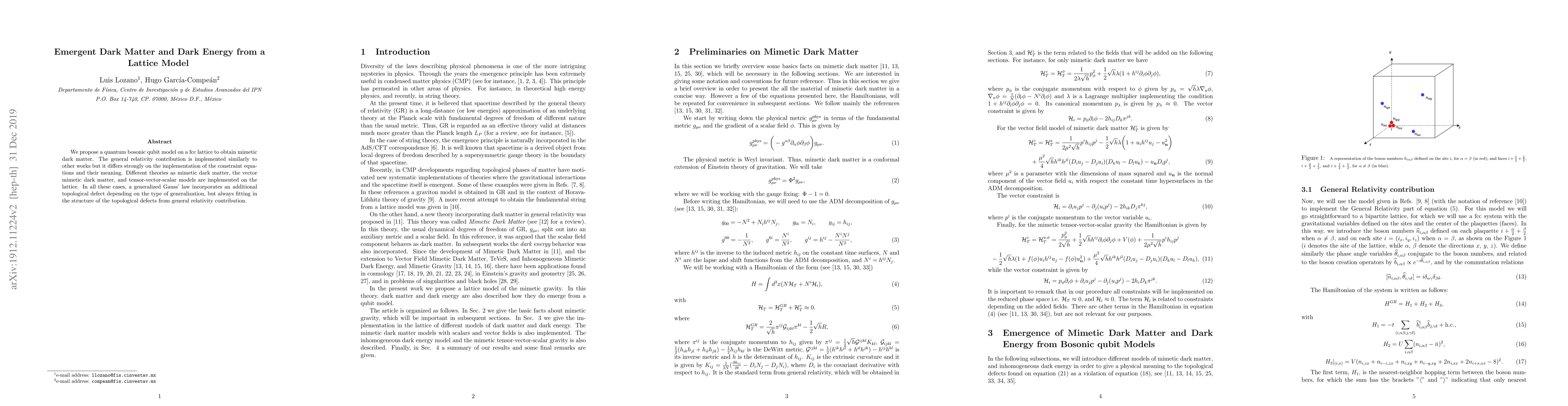 This paper proposes a quantum bosonic qubit model on an fcc lattice to simulate emergent dark matter and dark energy through mimetic theories, incorporating a generalized Gauss' law with topological defects that fit within the framework of general relativity. The model uniquely handles constraint equations and their implications for different mimetic dark matter theories.