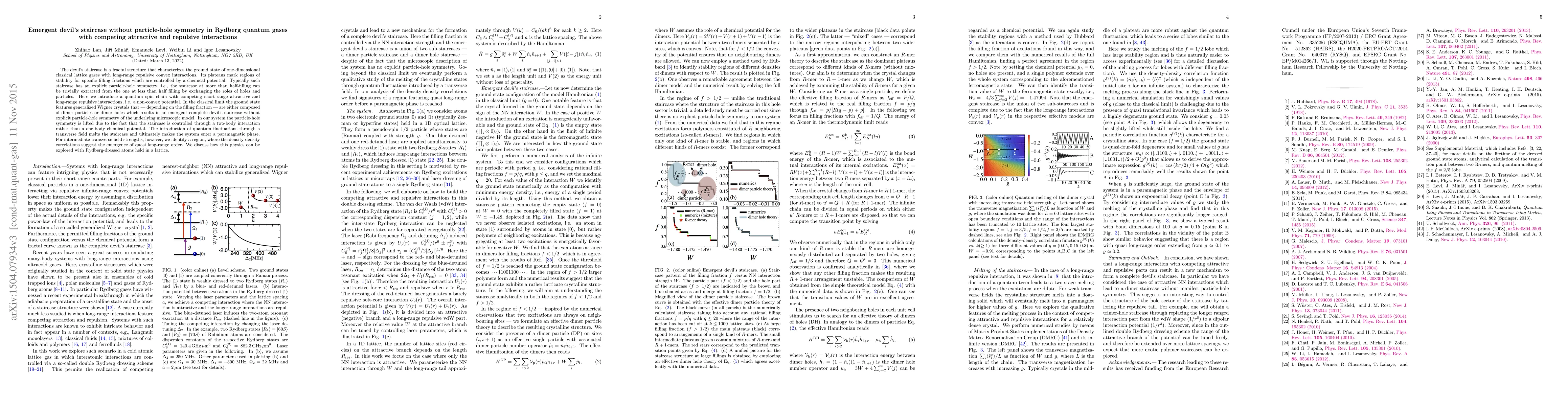 The devil's staircase is a fractal structure that characterizes the ground state of one-dimensional classical lattice gases with long-range repulsive convex interactions. Its plateaus mark regions of stability for specific filling fractions which are controlled by a chemical potential. Typically such staircase has an explicit particle-hole symmetry, i.e., the staircase at more than half-filling can be trivially extracted from the one at less than half filling by exchanging the roles of holes and particles. Here we introduce a quantum spin chain with competing short-range attractive and long-range repulsive interactions, i.e. a non-convex potential. In the classical limit the ground state features generalized Wigner crystals that --- depending on the filling fraction --- are either composed of dimer particles or dimer holes which results in an emergent complete devil's staircase without explicit particle-hole symmetry of the underlying microscopic model. In our system the particle-hole symmetry is lifted due to the fact that the staircase is controlled through a two-body interaction rather than a one-body chemical potential. The introduction of quantum fluctuations through a transverse field melts the staircase and ultimately makes the system enter a paramagnetic phase. For intermediate transverse field strengths, however, we identify a region, where the density-density correlations suggest the emergence of quasi long-range order. We discuss how this physics can be explored with Rydberg-dressed atoms held in a lattice.