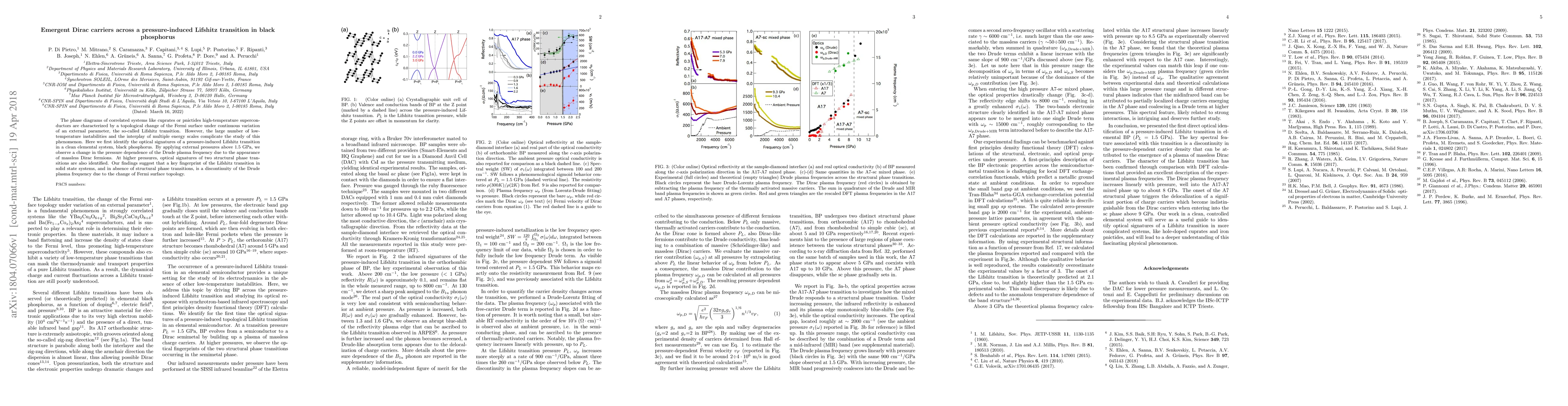This study identifies a pressure-induced Lifshitz transition in black phosphorus, marked by the emergence of Dirac fermions, evidenced by changes in the Drude plasma frequency. The findings suggest that the discontinuity in the Drude plasma frequency signifies a topological change in the Fermi surface.