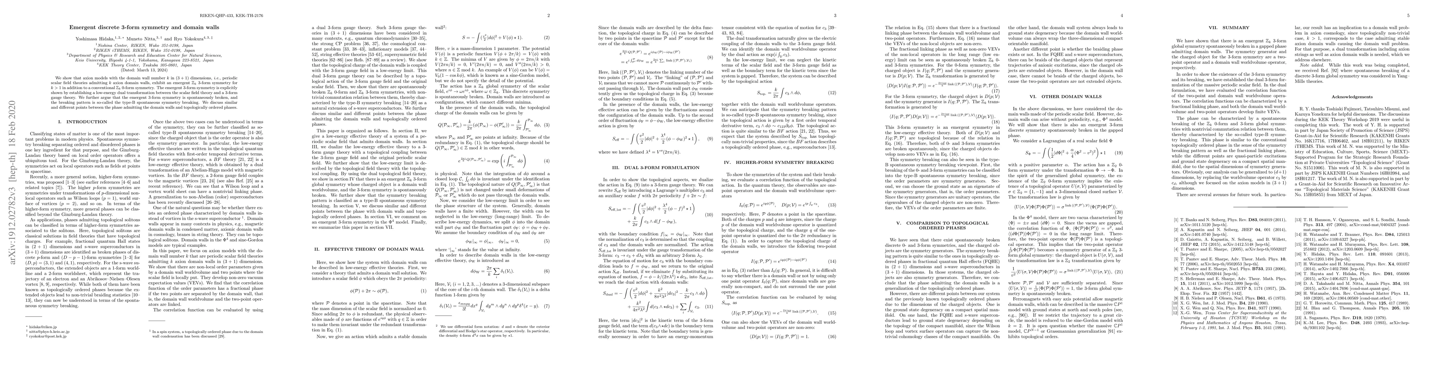 We show that axion models with the domain wall number $k$ in $(3+1)$ dimensions, i.e., periodic scalar field theories admitting $k$ axion domain walls, exhibit an emergent ${\mathbb Z}_k$ 3-form symmetry for $k >1$ in addition to a conventional ${\mathbb Z}_k$ 0-form symmetry. The emergent 3-form symmetry is explicitly shown by establishing a low-energy dual transformation between the scalar field theory and a 3-form gauge theory. We further argue that the emergent 3-form symmetry is spontaneously broken, and the breaking pattern is so-called the type-B spontaneous symmetry breaking. We discuss similar and different points between the phase admitting the domain walls and topologically ordered phases.
