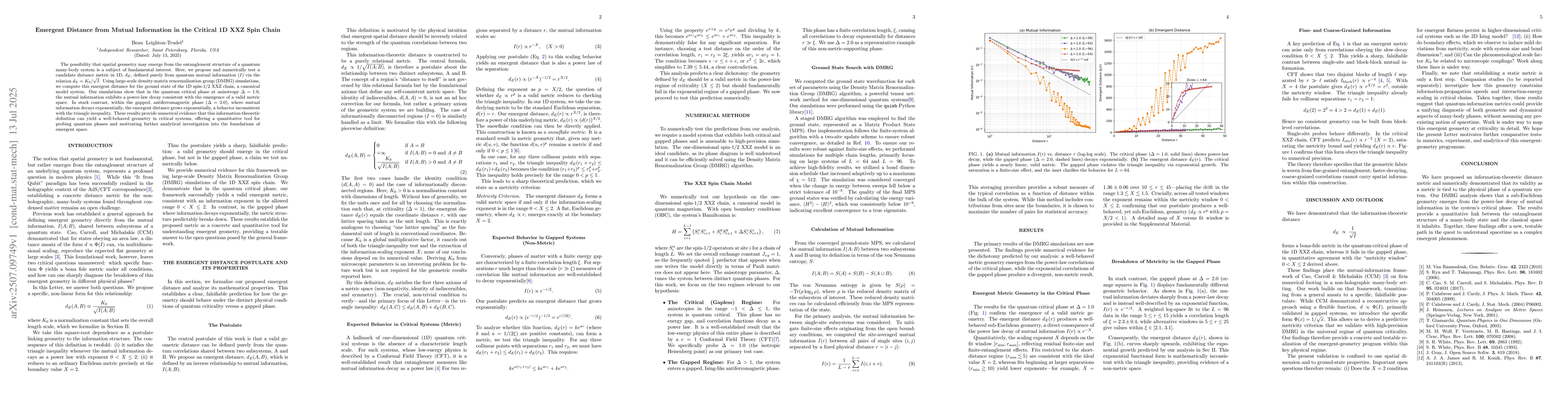 The possibility that spatial geometry may emerge from the entanglement structure of a quantum many-body system is a subject of fundamental interest. Here, we propose and numerically test a candidate distance metric in 1D, d_E, defined purely from quantum mutual information (I) via the relation d_E = K_0 / sqrt(I). Using large-scale density-matrix renormalization group (DMRG) simulations, we compute this emergent distance for the ground state of the 1D spin-1/2 XXZ chain, a canonical model system. Our simulations show that in the quantum critical phase at anisotropy $\Delta = 1.0$, the mutual information exhibits a power-law decay consistent with the emergence of a valid metric space. In stark contrast, within the gapped, antiferromagnetic phase ($\Delta = 2.0$), where mutual information decays exponentially, the emergent distance grows exponentially, a behavior inconsistent with the triangle inequality. These results provide numerical evidence that this information-theoretic definition can yield a well-behaved geometry in critical systems, offering a quantitative tool for probing quantum phases and motivating further analytical investigation into the foundations of emergent space.