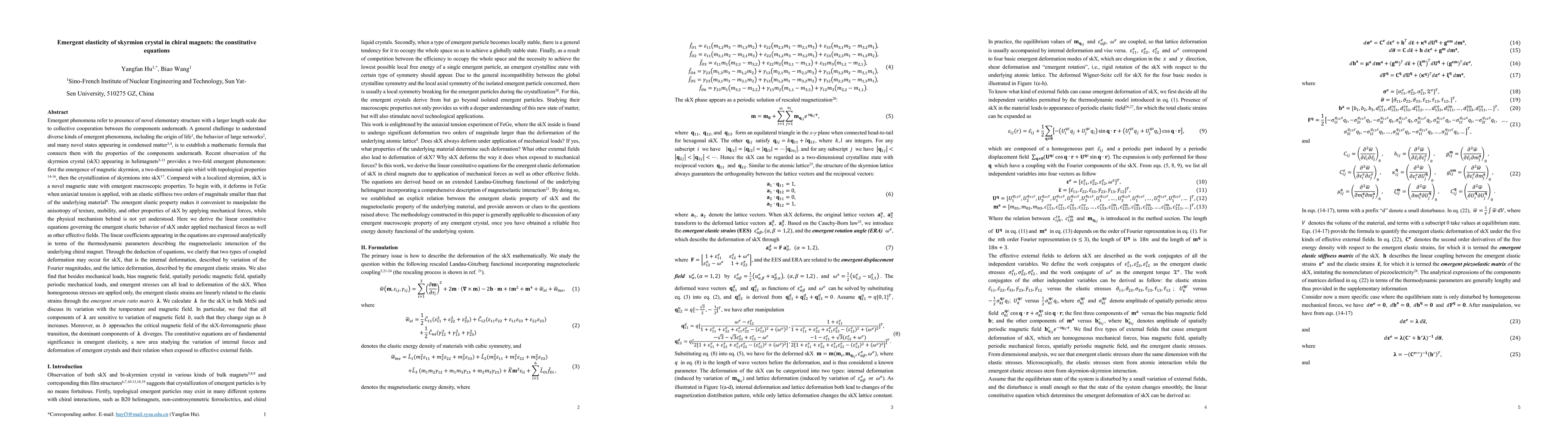 Researchers derived linear constitutive equations for the emergent elasticity of a skyrmion crystal in chiral magnets, revealing that various external fields can lead to deformation, including mechanical loads and magnetic fields.