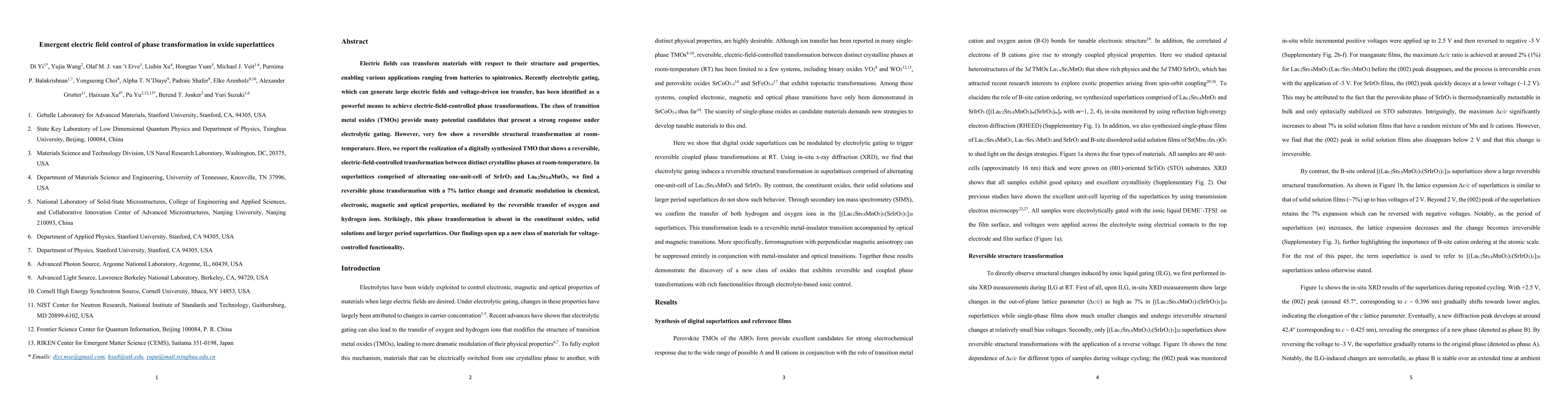 This paper reports the reversible, electric-field-controlled phase transformation between distinct crystalline phases in digitally synthesized oxide superlattices of SrIrO3 and La0.2Sr0.8MnO3 at room temperature, mediated by ion transfer, with significant changes in chemical, electronic, magnetic, and optical properties. This transformation is unique to the superlattice structure and not observed in individual oxides or other configurations.