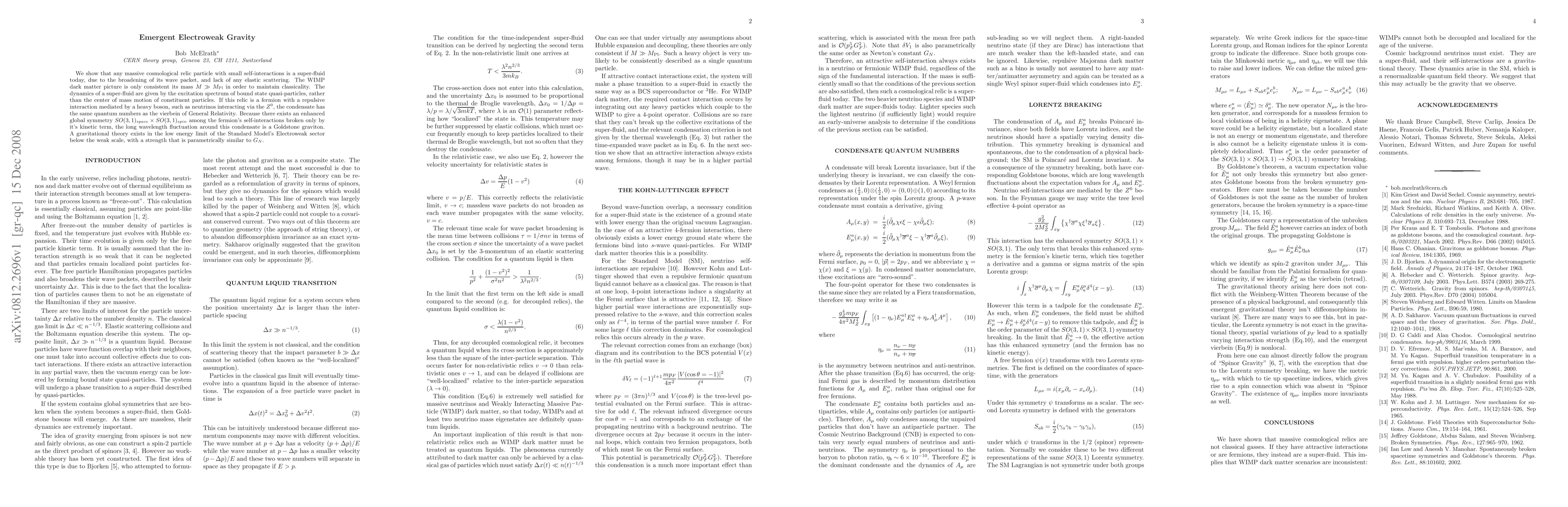 We show that any massive cosmological relic particle with small self-interactions is a super-fluid today, due to the broadening of its wave packet, and lack of any elastic scattering. The WIMP dark matter picture is only consistent its mass $M \gg M_{\rm Pl}$ in order to maintain classicality. The dynamics of a super-fluid are given by the excitation spectrum of bound state quasi-particles, rather than the center of mass motion of constituent particles. If this relic is a fermion with a repulsive interaction mediated by a heavy boson, such as neutrinos interacting via the $Z^0$, the condensate has the same quantum numbers as the vierbein of General Relativity. Because there exists an enhanced global symmetry $SO(3,1)_{space}\times SO(3,1)_{spin}$ among the fermion's self-interactions broken only by its kinetic term, the long wavelength fluctuation around this condensate is a Goldstone graviton. A gravitational theory exists in the low energy limit of the Standard Model's Electroweak sector below the weak scale, with a strength that is parametrically similar to $G_N$.