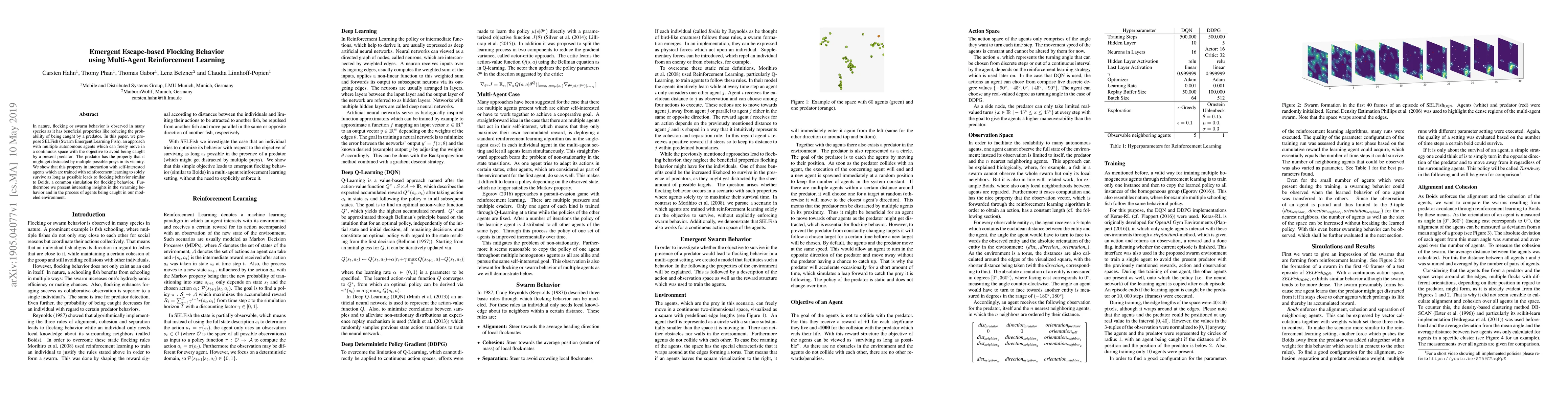 Researchers propose a method for swarm behavior inspired by nature, where autonomous agents learn to avoid predators using reinforcement learning, leading to emergent flocking behavior similar to Boids. The study provides insights into the swarming behavior and its implications for understanding natural phenomena.