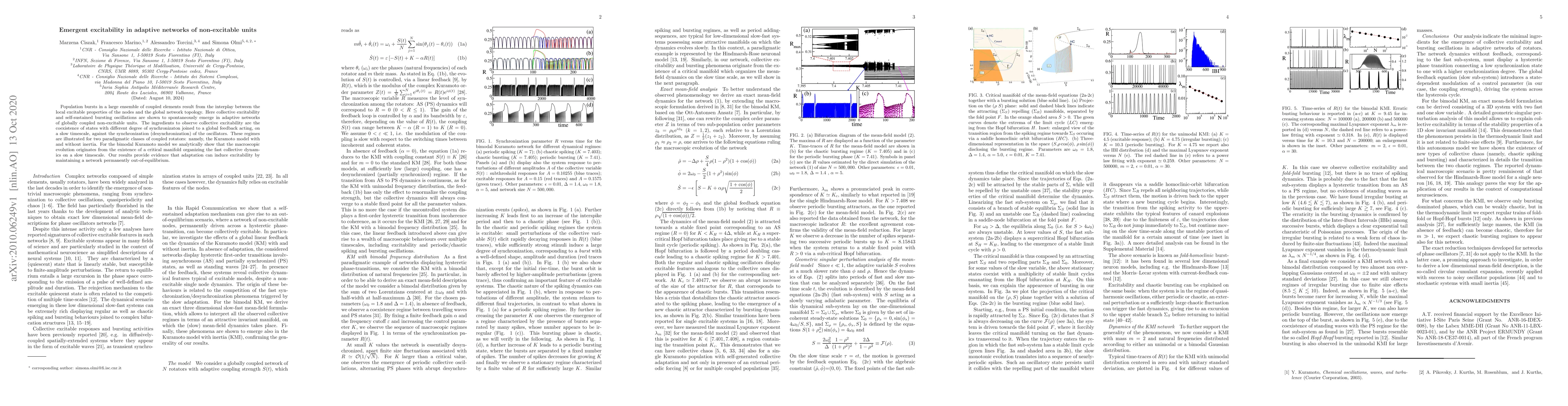 Population bursts in a large ensemble of coupled elements result from the interplay between the local excitable properties of the nodes and the global network topology. Here collective excitability and self-sustained bursting oscillations are shown to spontaneously emerge in adaptive networks of globally coupled non-excitable units. The ingredients to observe collective excitability are the coexistence of states with different degree of synchronizaton joined to a global feedback acting, on a slow timescale, against the synchronization (desynchronization) of the oscillators. These regimes are illustrated for two paradigmatic classes of coupled rotators: namely, the Kuramoto model with and without inertia. For the bimodal Kuramoto model we analytically show that the macroscopic evolution originates from the existence of a critical manifold organizing the fast collective dynamics on a slow timescale. Our results provide evidence that adaptation can induce excitability by maintaining a network permanently out-of-equilibrium.
