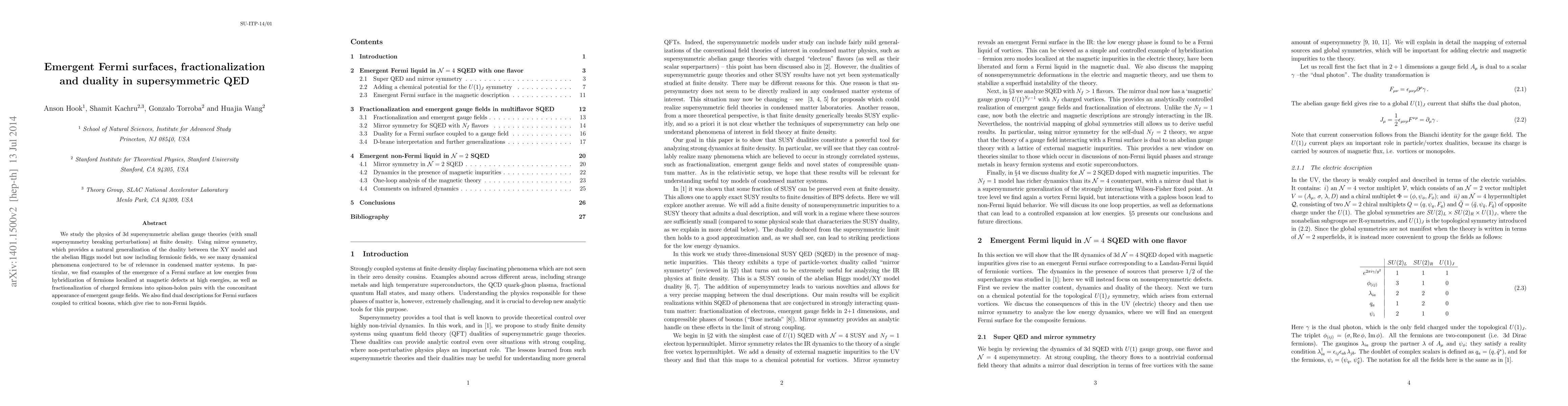 We study the physics of 3d supersymmetric abelian gauge theories (with small supersymmetry breaking perturbations) at finite density. Using mirror symmetry, which provides a natural generalization of the duality between the XY model and the abelian Higgs model but now including fermionic fields, we see many dynamical phenomena conjectured to be of relevance in condensed matter systems. In particular, we find examples of the emergence of a Fermi surface at low energies from hybridization of fermions localized at magnetic defects at high energies, as well as fractionalization of charged fermions into spinon-holon pairs with the concomitant appearance of emergent gauge fields. We also find dual descriptions for Fermi surfaces coupled to critical bosons, which give rise to non-Fermi liquids.