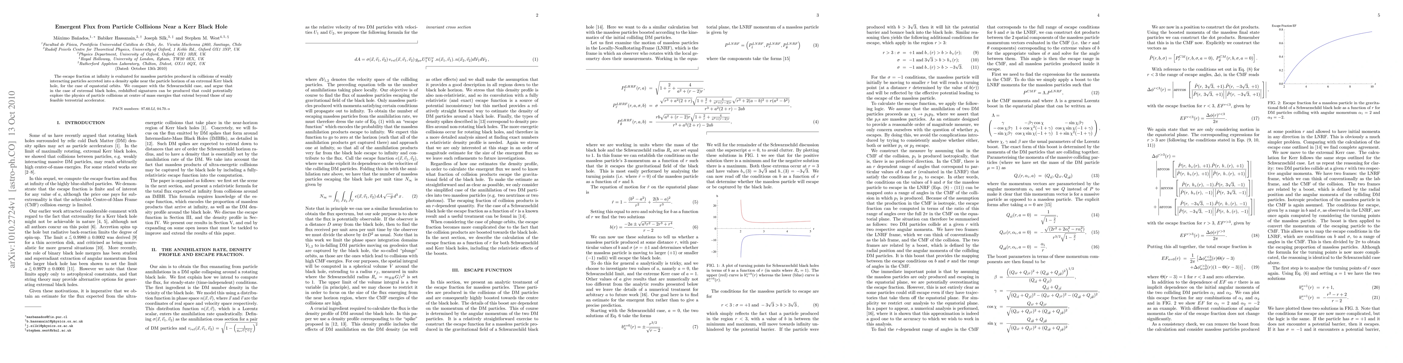 The escape fraction at infinity is evaluated for massless particles produced in collisions of weakly interacting particles accreted into a density spike near the particle horizon of an extremal Kerr black hole, for the case of equatorial orbits. We compare with the Schwarzschild case, and argue that in the case of extremal black holes, redshifted signatures can be produced that could potentially explore the physics of particle collisions at centre of mass energies that extend beyond those of any feasible terrestrial accelerator.