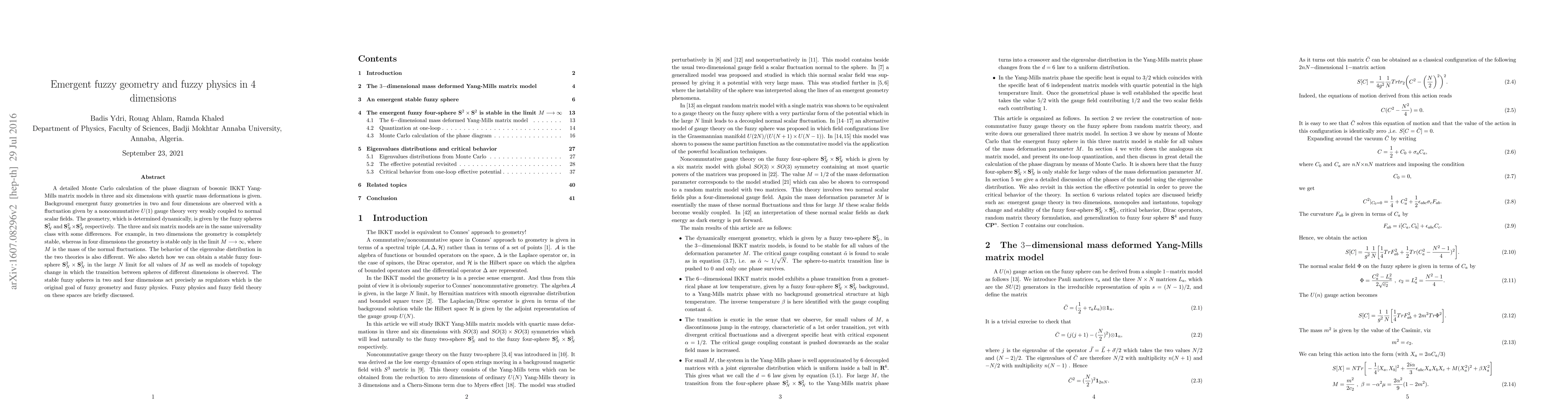 A detailed Monte Carlo calculation of the phase diagram of bosonic IKKT Yang-Mills matrix models in three and six dimensions with quartic mass deformations is given. Background emergent fuzzy geometries in two and four dimensions are observed with a fluctuation given by a noncommutative $U(1)$ gauge theory very weakly coupled to normal scalar fields. The geometry, which is determined dynamically, is given by the fuzzy spheres ${\bf S}^2_N$ and ${\bf S}^2_N\times{\bf S}^2_N$ respectively. The three and six matrix models are in the same universality class with some differences. For example, in two dimensions the geometry is completely stable, whereas in four dimensions the geometry is stable only in the limit $M\longrightarrow \infty$, where $M$ is the mass of the normal fluctuations. The behavior of the eigenvalue distribution in the two theories is also different. We also sketch how we can obtain a stable fuzzy four-sphere ${\bf S}^2_N\times{\bf S}^2_N$ in the large $N$ limit for all values of $M$ as well as models of topology change in which the transition between spheres of different dimensions is observed. The stable fuzzy spheres in two and four dimensions act precisely as regulators which is the original goal of fuzzy geometry and fuzzy physics. Fuzzy physics and fuzzy field theory on these spaces are briefly discussed.