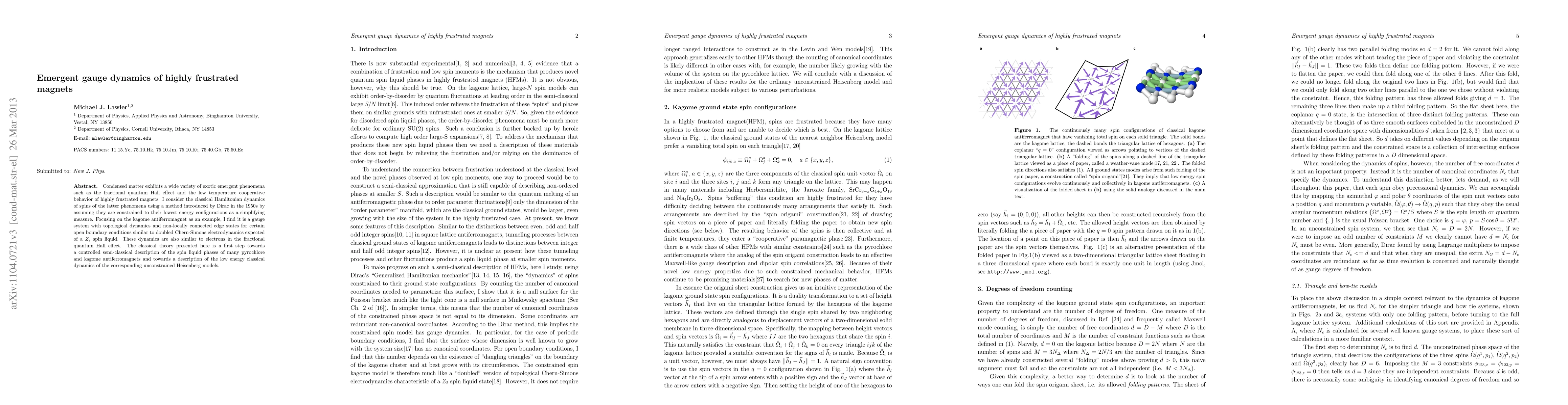 Condensed matter exhibits a wide variety of exotic emergent phenomena such as the fractional quantum Hall effect and the low temperature cooperative behavior of highly frustrated magnets. I consider the classical Hamiltonian dynamics of spins of the latter phenomena using a method introduced by Dirac in the 1950s by assuming they are constrained to their lowest energy configurations as a simplifying measure. Focusing on the kagome antiferromagnet as an example, I find it is a gauge system with topological dynamics and non-locally connected edge states for certain open boundary conditions similar to doubled Chern-Simons electrodynamics expected of a $Z_2$ spin liquid. These dynamics are also similar to electrons in the fractional quantum Hall effect. The classical theory presented here is a first step towards a controlled semi-classical description of the spin liquid phases of many pyrochlore and kagome antiferromagnets and towards a description of the low energy classical dynamics of the corresponding unconstrained Heisenberg models.