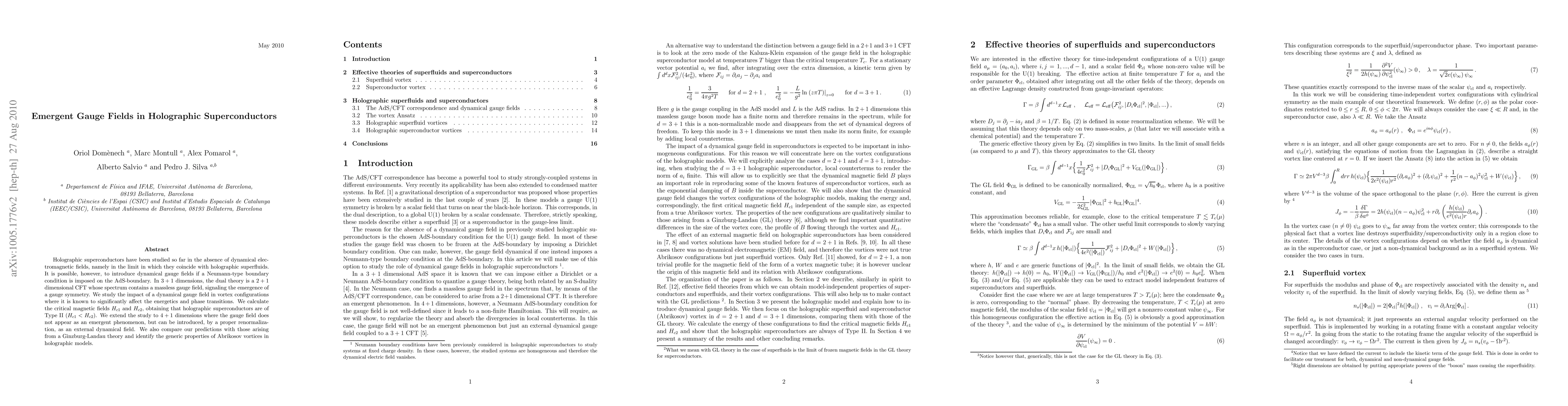 Holographic superconductors have been studied so far in the absence of dynamical electromagnetic fields, namely in the limit in which they coincide with holographic superfluids. It is possible, however, to introduce dynamical gauge fields if a Neumann-type boundary condition is imposed on the AdS-boundary. In 3+1 dimensions, the dual theory is a 2+1 dimensional CFT whose spectrum contains a massless gauge field, signaling the emergence of a gauge symmetry. We study the impact of a dynamical gauge field in vortex configurations where it is known to significantly affect the energetics and phase transitions. We calculate the critical magnetic fields H_c1 and H_c2, obtaining that holographic superconductors are of Type II (H_c1 < H_c2). We extend the study to 4+1 dimensions where the gauge field does not appear as an emergent phenomena, but can be introduced, by a proper renormalization, as an external dynamical field. We also compare our predictions with those arising from a Ginzburg-Landau theory and identify the generic properties of Abrikosov vortices in holographic models.