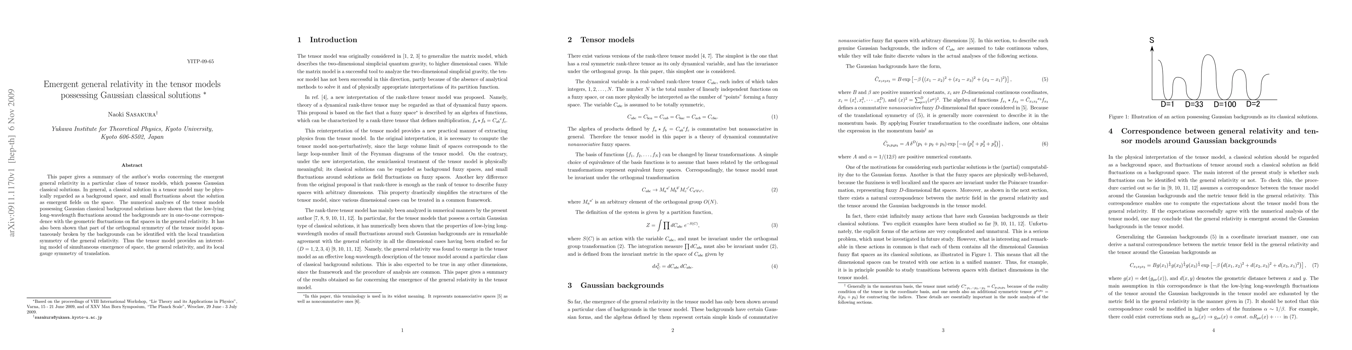 This paper gives a summary of the author's works concerning the emergent general relativity in a particular class of tensor models, which possess Gaussian classical solutions. In general, a classical solution in a tensor model may be physically regarded as a background space, and small fluctuations about the solution as emergent fields on the space. The numerical analyses of the tensor models possessing Gaussian classical background solutions have shown that the low-lying long-wavelength fluctuations around the backgrounds are in one-to-one correspondence with the geometric fluctuations on flat spaces in the general relativity. It has also been shown that part of the orthogonal symmetry of the tensor model spontaneously broken by the backgrounds can be identified with the local translation symmetry of the general relativity. Thus the tensor model provides an interesting model of simultaneous emergence of space, the general relativity, and its local gauge symmetry of translation.