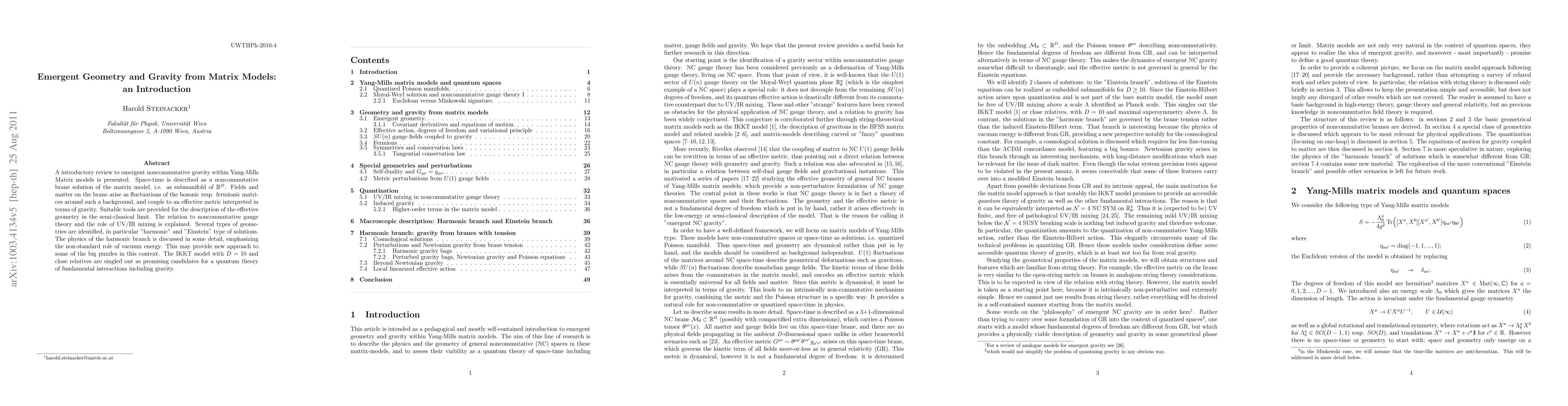 This paper introduces emergent noncommutative gravity in Yang-Mills Matrix models, describing space-time as a noncommutative brane solution. It discusses the coupling of fields to an effective metric, the role of UV/IR mixing, and identifies harmonic and Einstein geometries, with a focus on the non-standard vacuum energy role in the harmonic branch. The IKKT model is highlighted as a promising candidate for a quantum theory of fundamental interactions including gravity.