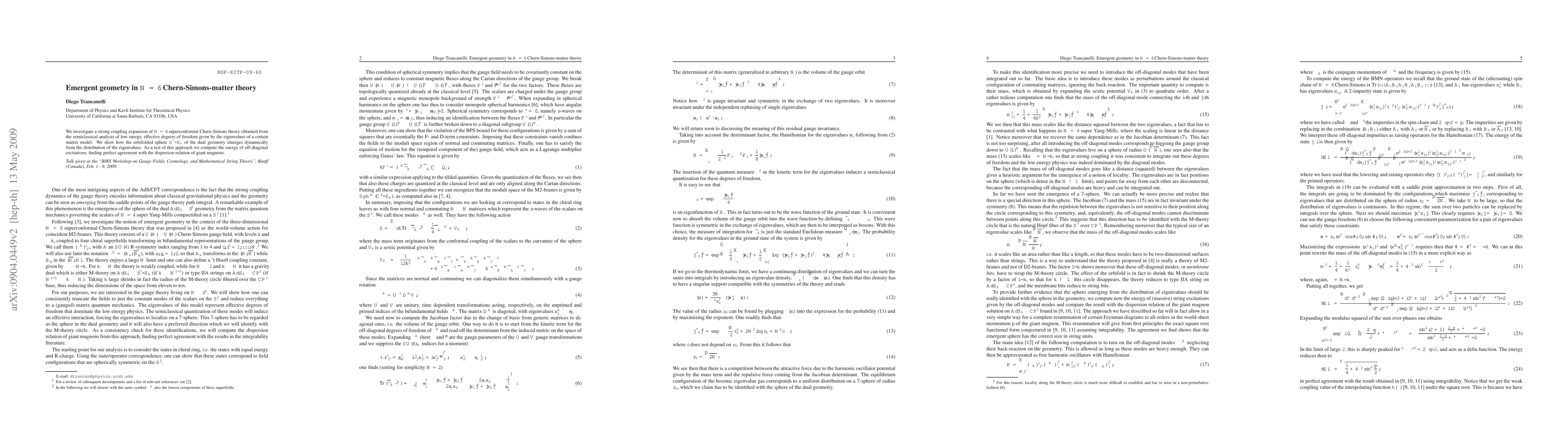 We investigate a strong coupling expansion of N=6 superconformal Chern-Simons theory obtained from the semiclassical analysis of low energy, effective degrees of freedom given by the eigenvalues of a certain matrix model. We show how the orbifolded sphere S^7/Z_k of the dual geometry emerges dynamically from the distribution of the eigenvalues. As a test of this approach we compute the energy of off-diagonal excitations, finding perfect agreement with the dispersion relation of giant magnons.