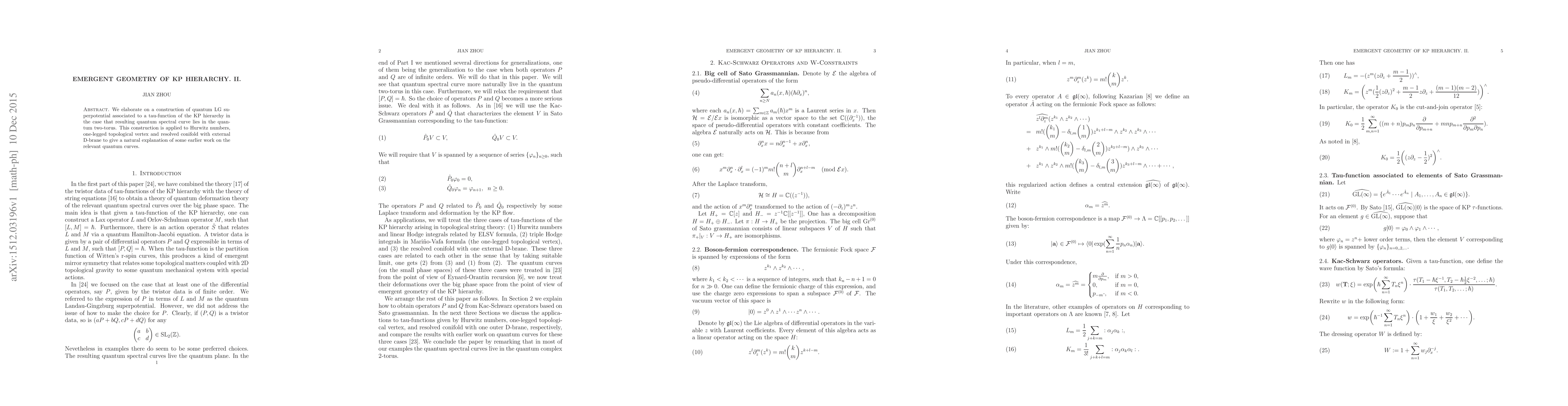 We elaborate on a construction of quantum LG superpotential associated to a tau-function of the KP hierarchy in the case that resulting quantum spectral curve lies in the quantum two-torus. This construction is applied to Hurwitz numbers, one-legged topological vertex and resolved conifold with external D-brane to give a natural explanation of some earlier work on the relevant quantum curves.