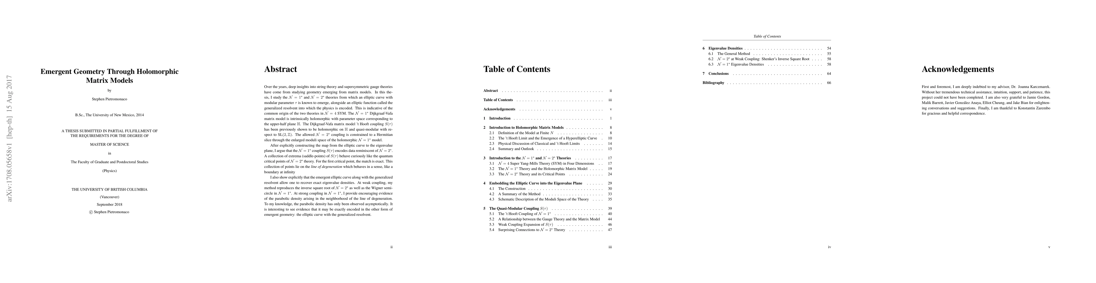 Over the years, deep insights into string theory and supersymmetric gauge theories have come from studying geometry emerging from matrix models. In this thesis, I study the N=1* and N=2* theories from which an elliptic curve is known to emerge, alongside an elliptic function called the generalized resolvent into which the physics is encoded. This is indicative of the common origin of the two theories in N=4 SYM. The N=1* Dijkgraaf-Vafa matrix model is intrinsically holomorphic with parameter space corresponding to the upper-half plane. The Dijkgraaf-Vafa matrix model 't Hooft coupling S has been previously shown to be holomorphic on the upper-half plane and quasi-modular with respect to SL(2,Z). The allowed N=2* coupling is constrained to a Hermitian slice through the enlarged moduli space of the holomorphic N=1* model. After explicitly constructing the map from the elliptic curve to the eigenvalue plane, I argue that the N=1* coupling S encodes data reminiscent of N=2*. A collection of extrema (saddle-points) of S behave curiously like the quantum critical points of N=2* theory. For the first critical point, the match is exact. This collection of points lie on the line of degeneration which behaves in a sense, like a boundary at infinity. I also show explicitly that the emergent elliptic curve along with the generalized resolvent allow one to recover exact eigenvalue densities. At weak coupling, my method reproduces the inverse square root of N=2* as well as the Wigner semi-circle in N=1*. At strong coupling in N=1*, I provide encouraging evidence of the parabolic density arising in the neighborhood of the line of degeneration. To my knowledge, the parabolic density has only been observed asymptotically. It is interesting to see evidence that it may be exactly encoded in the other form of emergent geometry: the elliptic curve with the generalized resolvent.