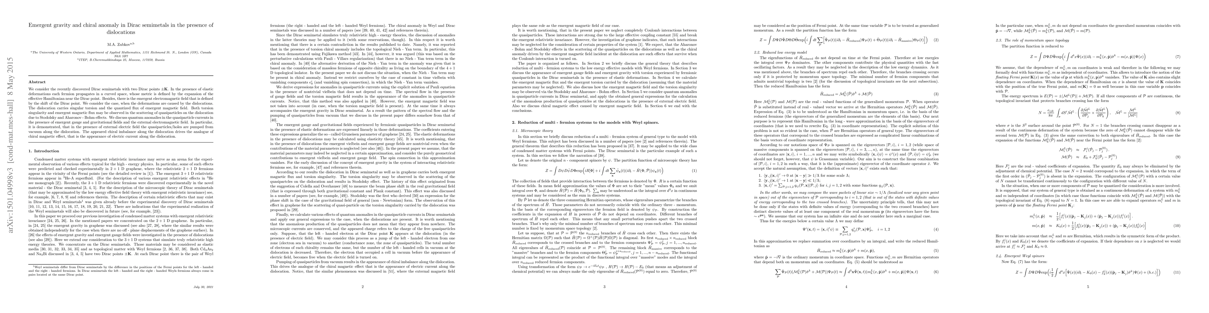 We consider the recently discovered Dirac semimetals with two Dirac points $\pm{\bf K}$. In the presence of elastic deformations each fermion propagates in a curved space, whose metric is defined by the expansion of the effective Hamiltonian near the Dirac point. Besides, there is the emergent electromagnetic field that is defined by the shift of the Dirac point. We consider the case, when the deformations are caused by the dislocations. The dislocation carries singular torsion and the quantized flux of emergent magnetic field. Both torsion singularity and emergent magnetic flux may be observed in the scattering of quasiparticles on the dislocation due to Stodolsky and Aharonov - Bohm effects. We discuss quantum anomalies in the quasiparticle currents in the presence of emergent gauge and gravitational fields and the external electromagnetic field. In particular, it is demonstrated, that in the presence of external electric field the quasiparticles/holes are pumped from vacuum along the dislocation. The appeared chiral imbalance along the dislocation drives the analogue of chiral magnetic effect, that is the appearance of electric current along the dislocation.