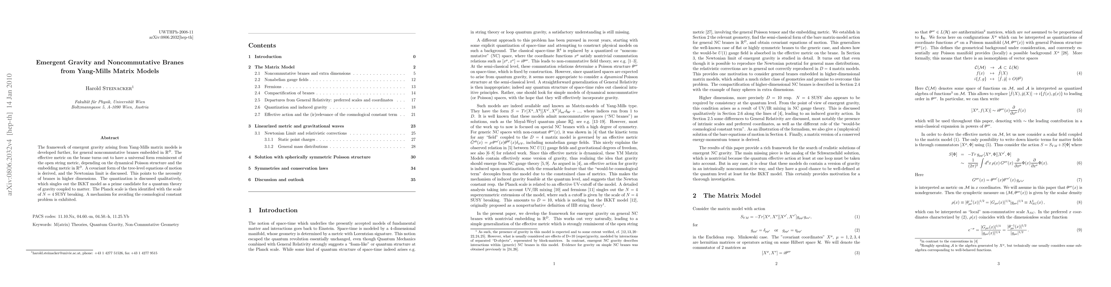 The framework of emergent gravity arising from Yang-Mills matrix models is developed further, for general noncommutative branes embedded in R^D. The effective metric on the brane turns out to have a universal form reminiscent of the open string metric, depending on the dynamical Poisson structure and the embedding metric in R^D. A covariant form of the tree-level equations of motion is derived, and the Newtonian limit is discussed. This points to the necessity of branes in higher dimensions. The quantization is discussed qualitatively, which singles out the IKKT model as a prime candidate for a quantum theory of gravity coupled to matter. The Planck scale is then identified with the scale of N=4 SUSY breaking. A mechanism for avoiding the cosmological constant problem is exhibited.