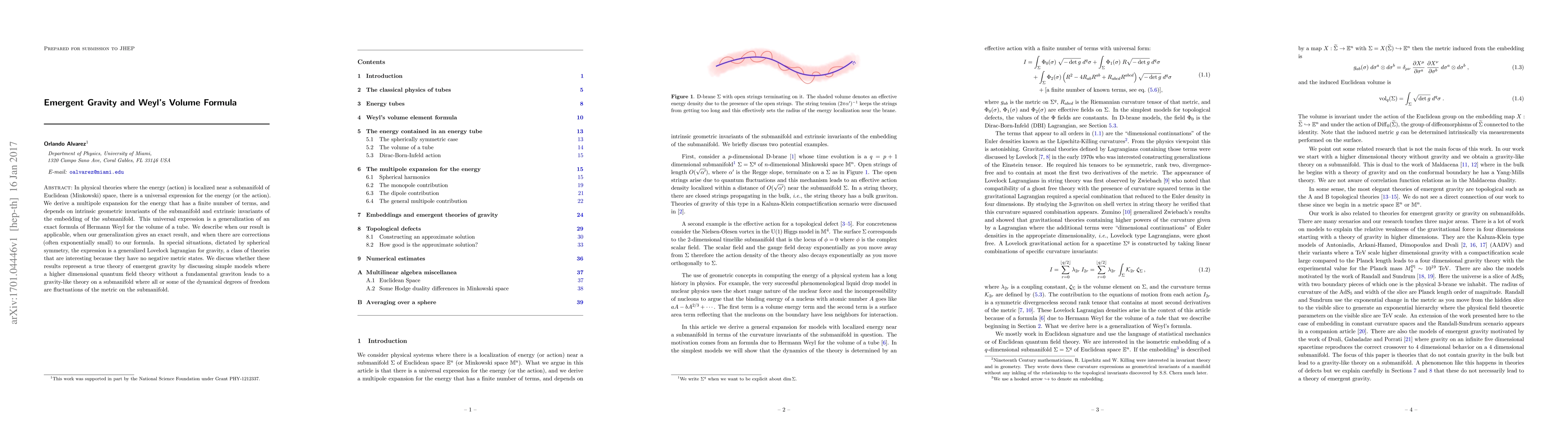In physical theories where the energy (action) is localized near a submanifold of Euclidean (Minkowski) space, there is a universal expression for the energy (or the action). We derive a multipole expansion for the energy that has a finite number of terms, and depends on intrinsic geometric invariants of the submanifold and extrinsic invariants of the embedding of the submanifold. This universal expression is a generalization of an exact formula of Hermann Weyl for the volume of a tube. We describe when our result is applicable, when our generalization gives an exact result, and when there are corrections (often exponentially small) to our formula. In special situations, dictated by spherical symmetry, the expression is a generalized Lovelock lagrangian for gravity, a class of theories that are interesting because they have no negative metric states. We discuss whether these results represent a true theory of emergent gravity by discussing simple models where a higher dimensional quantum field theory without a fundamental graviton leads to a gravity-like theory on a submanifold where all or some of the dynamical degrees of freedom are fluctuations of the metric on the submanifold.