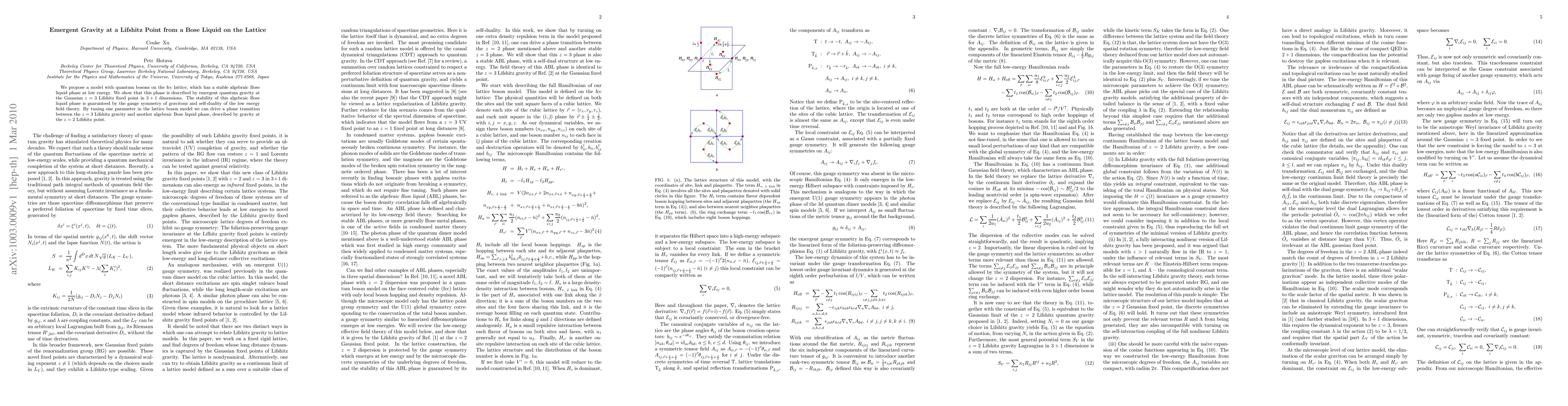 Researchers propose a model showing that a certain type of boson on a lattice can exhibit emergent gravity at specific Lifshitz points, with stability guaranteed by gauge symmetry and self-duality.