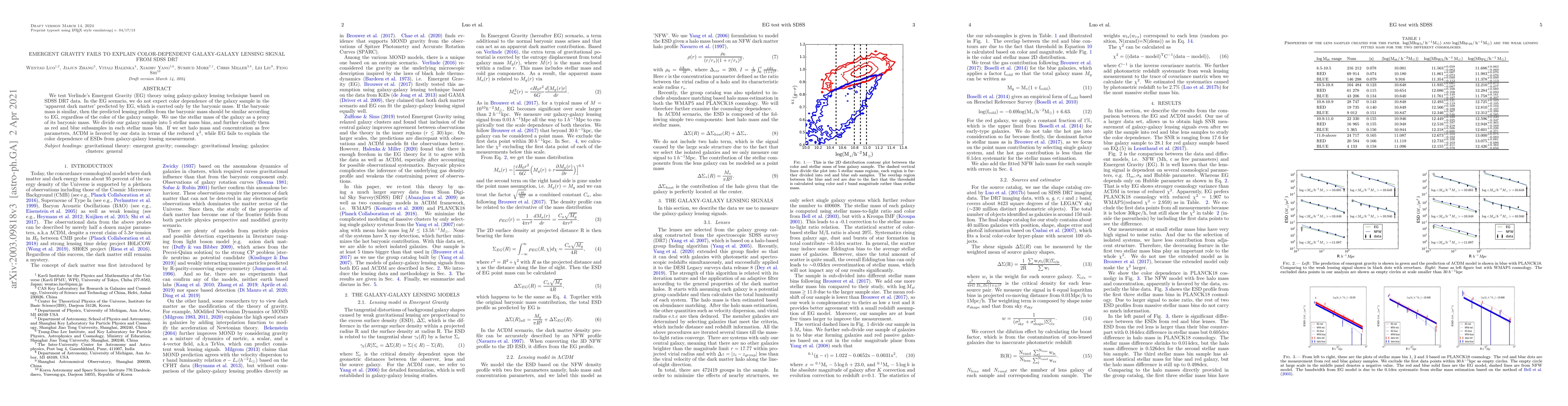 This study tests Emergent Gravity (EG) theory against galaxy-galaxy lensing data from SDSS DR7, finding that EG fails to explain color-dependent lensing signals. While EG predicts similar lensing profiles from baryonic mass regardless of galaxy color, the data shows significant color dependence, favoring $\Lambda$CDM over EG.