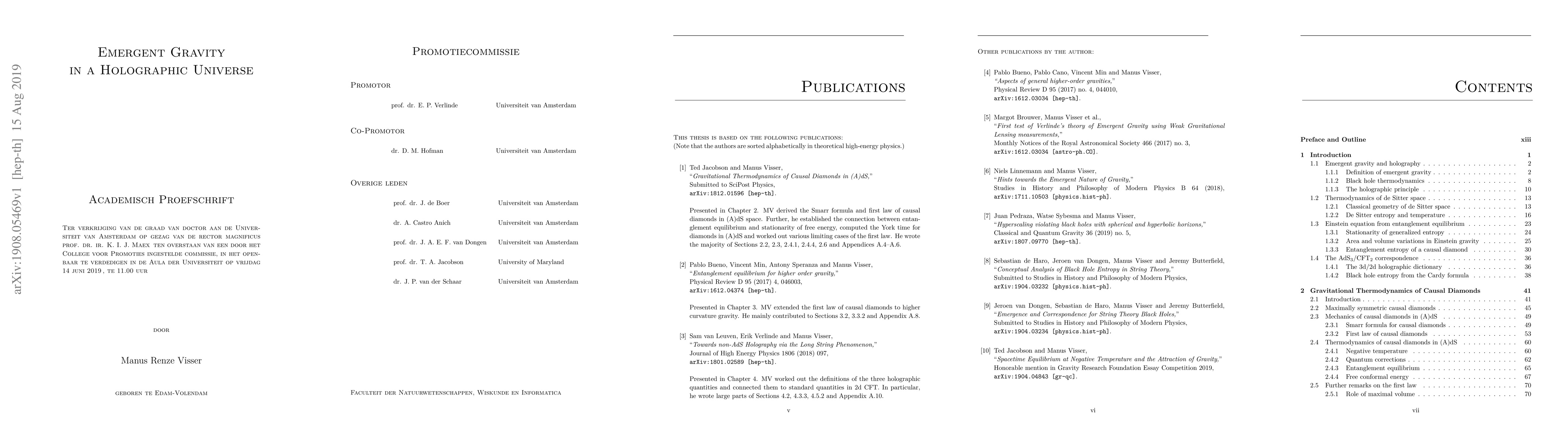 This dissertation investigates thermodynamic, emergent and holographic aspects of gravity in the context of causal diamonds. We obtain a gravitational first law for causal diamonds in maximally symmetric spacetimes and argue that these diamonds are in thermodynamic equilibrium at negative temperature. Further, gravitational field equations, including higher curvature corrections, are derived from an equilibrium condition on the generalized entropy of small maximally symmetric diamonds. Finally, we assign three holographic microscopic quantities to causal diamonds in spherically symmetric spacetimes, and for non-AdS geometries we interpret them in terms of the long string degrees of freedom of symmetric product conformal field theories.