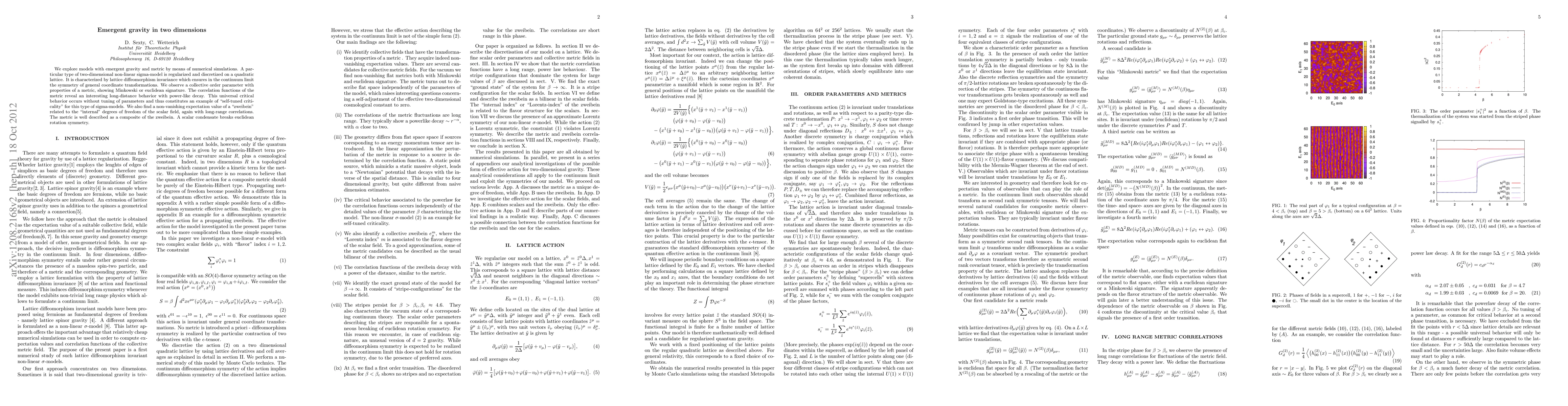 This research paper explores emergent gravity in two dimensions using numerical simulations of a specific type of non-linear sigma-model. It reveals collective order parameters with metric properties and long-distance behavior with power-like decay.