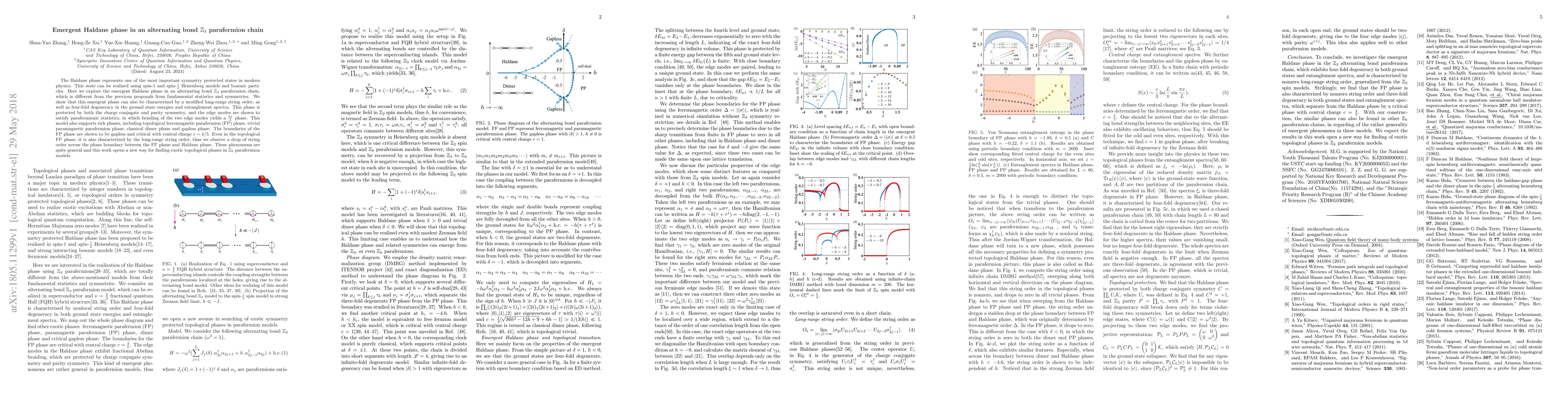 The Haldane phase represents one of the most important symmetry protected states in modern physics. This state can be realized using spin-1 and spin-${1\over 2}$ Heisenberg models and bosonic particles. Here we explore the emergent Haldane phase in an alternating bond $\mathbb{Z}_3$ parafermion chain, which is different from the previous proposals from fundamental statistics and symmetries. We show that this emergent phase can also be characterized by a modified long-range string order, as well as four-fold degeneracy in the ground state energies and entanglement spectra. This phase is protected by both the charge conjugate and parity symmetry, and the edge modes are shown to satisfy parafermionic statistics, in which braiding of the two edge modes yields a ${2\pi \over 3}$ phase. This model also supports rich phases, including topological ferromagnetic parafermion (FP) phase, trivial paramagnetic parafermion phase, classical dimer phase and gapless phase. The boundaries of the FP phase are shown to be gapless and critical with central charge $c = 4/5$. Even in the topological FP phase, it is also characterized by the long-range string order, thus we observe a drop of string order across the phase boundary between the FP phase and Haldane phase. These phenomena are quite general and this work opens a new way for finding exotic topological phases in $\mathbb{Z}_k$ parafermion models.