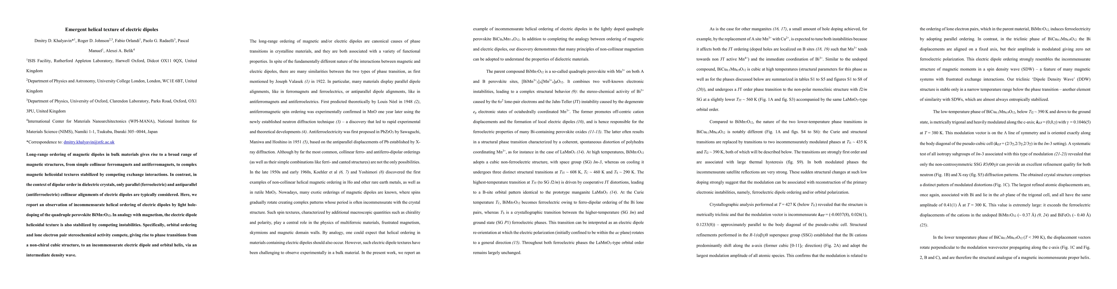 This paper reports the first observation of helical ordering of electric dipoles in dielectric crystals, achieved through light hole-doping of BiMn7O12. This helical texture, analogous to magnetic helicoidal textures, emerges due to competing orbital ordering and lone electron pair stereochemical activity, leading to phase transitions from a cubic structure to an incommensurate electric dipole and orbital helix.