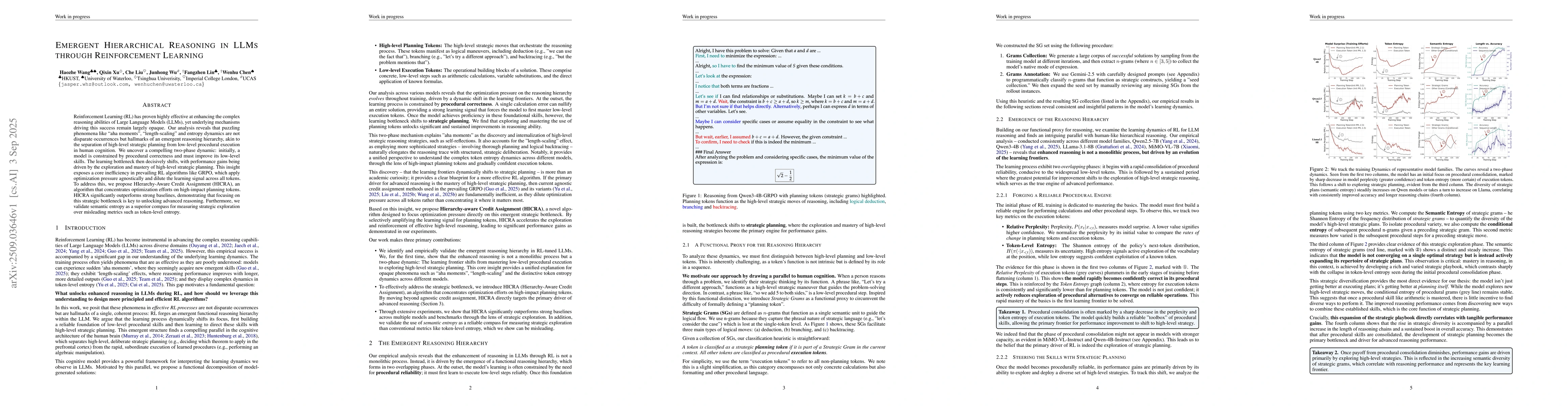 Reinforcement Learning (RL) has proven highly effective at enhancing the complex reasoning abilities of Large Language Models (LLMs), yet underlying mechanisms driving this success remain largely opaque. Our analysis reveals that puzzling phenomena like ``aha moments", ``length-scaling'' and entropy dynamics are not disparate occurrences but hallmarks of an emergent reasoning hierarchy, akin to the separation of high-level strategic planning from low-level procedural execution in human cognition. We uncover a compelling two-phase dynamic: initially, a model is constrained by procedural correctness and must improve its low-level skills. The learning bottleneck then decisively shifts, with performance gains being driven by the exploration and mastery of high-level strategic planning. This insight exposes a core inefficiency in prevailing RL algorithms like GRPO, which apply optimization pressure agnostically and dilute the learning signal across all tokens. To address this, we propose HIerarchy-Aware Credit Assignment (HICRA), an algorithm that concentrates optimization efforts on high-impact planning tokens. HICRA significantly outperforms strong baselines, demonstrating that focusing on this strategic bottleneck is key to unlocking advanced reasoning. Furthermore, we validate semantic entropy as a superior compass for measuring strategic exploration over misleading metrics such as token-level entropy.