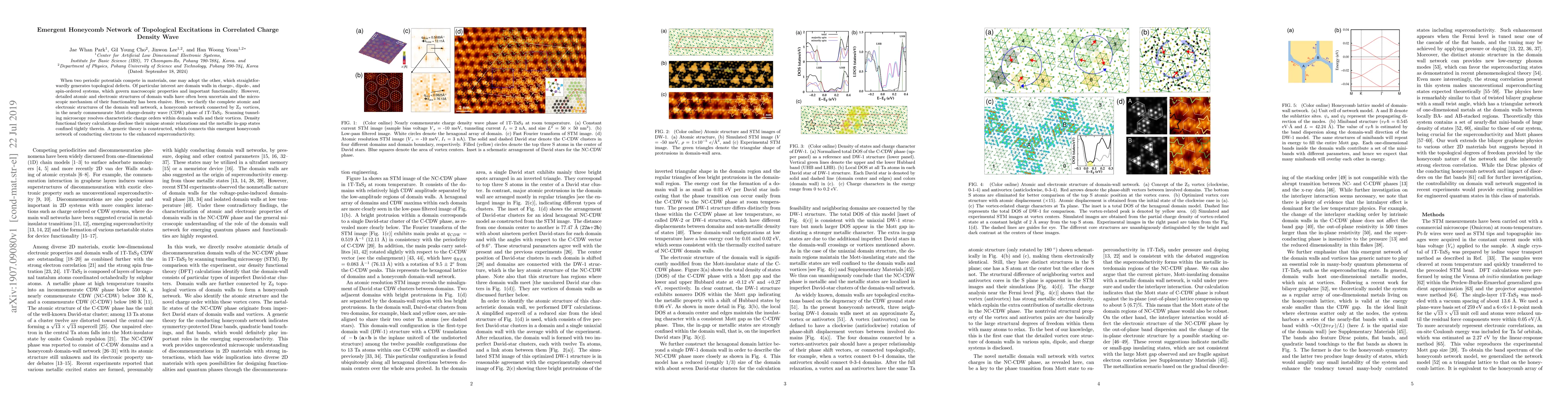 When two periodic potentials compete in materials, one may adopt the other, which straightforwardly generates topological defects. Of particular interest are domain walls in charge-, dipole-, and spin-ordered systems, which govern macroscopic properties and important functionality. However, detailed atomic and electronic structures of domain walls have often been uncertain and the microscopic mechanism of their functionality has been elusive. Here, we clarify the complete atomic and electronic structures of the domain wall network, a honeycomb network connected by Z$_{3}$ vortices, in the nearly commensurate Mott charge-density wave (CDW) phase of 1T-TaS$_{2}$. Scanning tunneling microscopy resolves characteristic charge orders within domain walls and their vortices. Density functional theory calculations disclose their unique atomic relaxations and the metallic in-gap states confined tightly therein. A generic theory is constructed, which connects this emergent honeycomb network of conducting electrons to the enhanced superconductivity.
