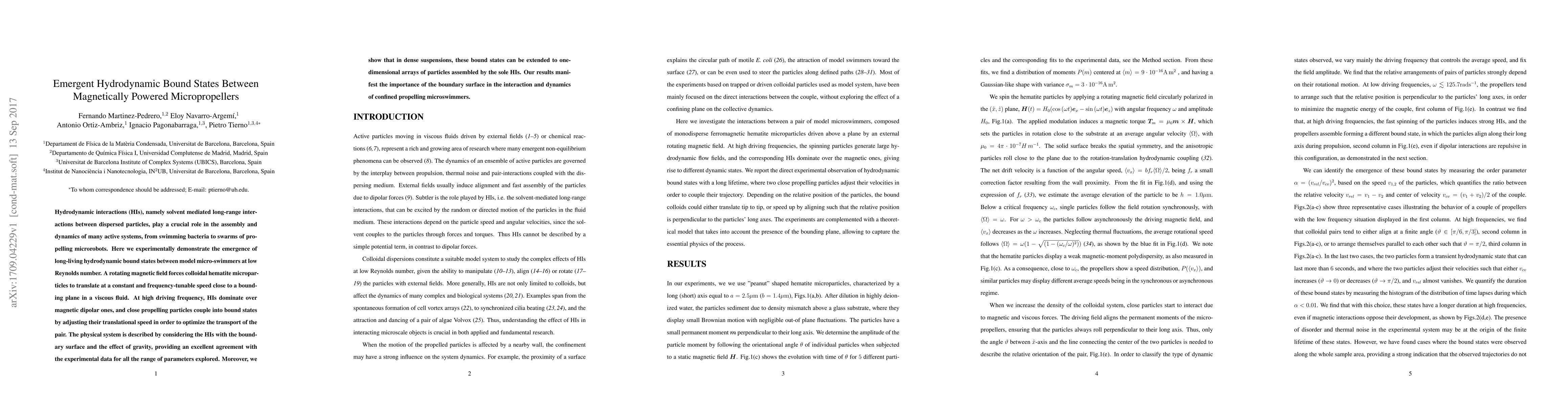 Hydrodynamic interactions (HIs), namely solvent mediated long-range interactions between dispersed particles, play a crucial role in the assembly and dynamics of many active systems, from swimming bacteria to swarms of propelling microrobots. Here we experimentally demonstrate the emergence of long-living hydrodynamic bound states between model micro-swimmers at low Reynolds number. A rotating magnetic field forces colloidal hematite microparticles to translate at a constant and frequency-tunable speed close to a bounding plane in a viscous fluid. At high driving frequency, HIs dominate over magnetic dipolar ones, and close propelling particles couple into bound states by adjusting their translational speed in order to optimize the transport of the pair. The physical system is described by considering the HIs with the boundary surface and the effect of gravity, providing an excellent agreement with the experimental data for all the range of parameters explored. Moreover, we show that in dense suspensions, these bound states can be extended to onedimensional arrays of particles assembled by the sole HIs. Our results manifest the importance of the boundary surface in the interaction and dynamics of confined propelling microswimmers.