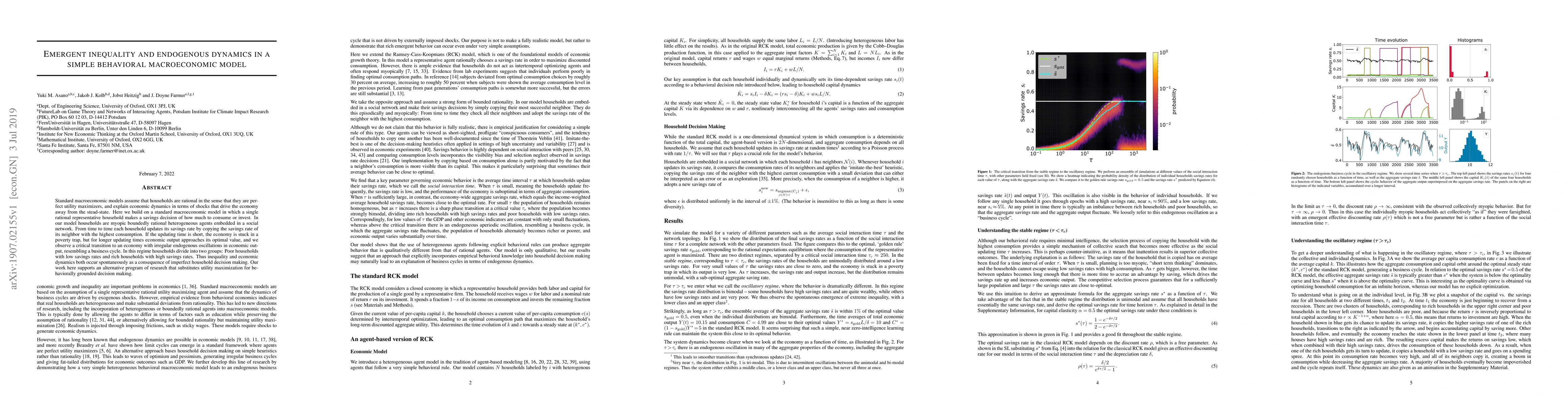 This paper explores a macroeconomic model where households are myopic and boundedly rational, leading to emergent inequality and endogenous dynamics. It finds that short updating periods result in poverty traps, while longer updating times lead to irregular economic oscillations and a division into poor and rich households, highlighting the role of behavioral decision-making in economic dynamics.