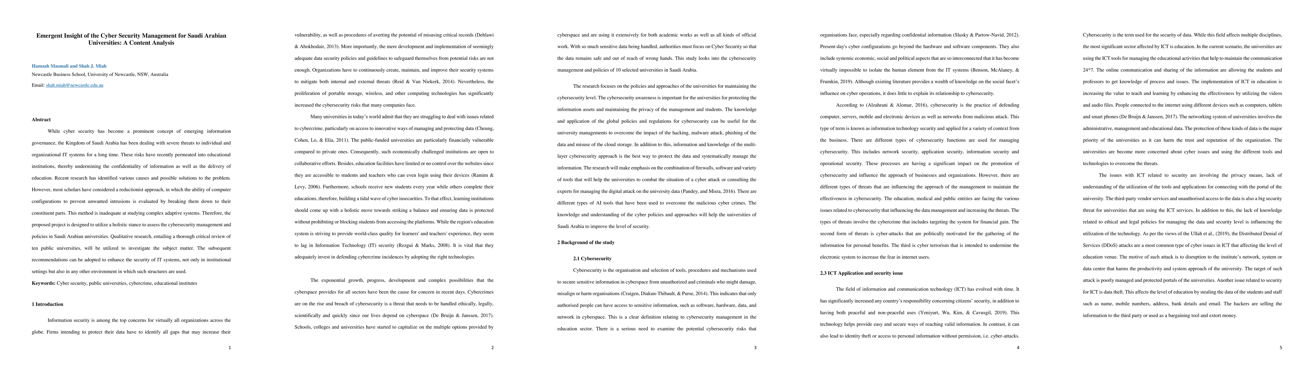While cyber security has become a prominent concept of emerging information governance, the Kingdom of Saudi Arabia has been dealing with severe threats to individual and organizational IT systems for a long time. These risks have recently permeated into educational institutions, thereby undermining the confidentiality of information as well as the delivery of education. Recent research has identified various causes and possible solutions to the problem. However, most scholars have considered a reductionist approach, in which the ability of computer configurations to prevent unwanted intrusions is evaluated by breaking them down to their constituent parts. This method is inadequate at studying complex adaptive systems. Therefore, the proposed project is designed to utilize a holistic stance to assess the cybersecurity management and policies in Saudi Arabian universities. Qualitative research, entailing a thorough critical review of ten public universities, will be utilized to investigate the subject matter. The subsequent recommendations can be adopted to enhance the security of IT systems, not only in institutional settings but also in any other environment in which such structures are used.