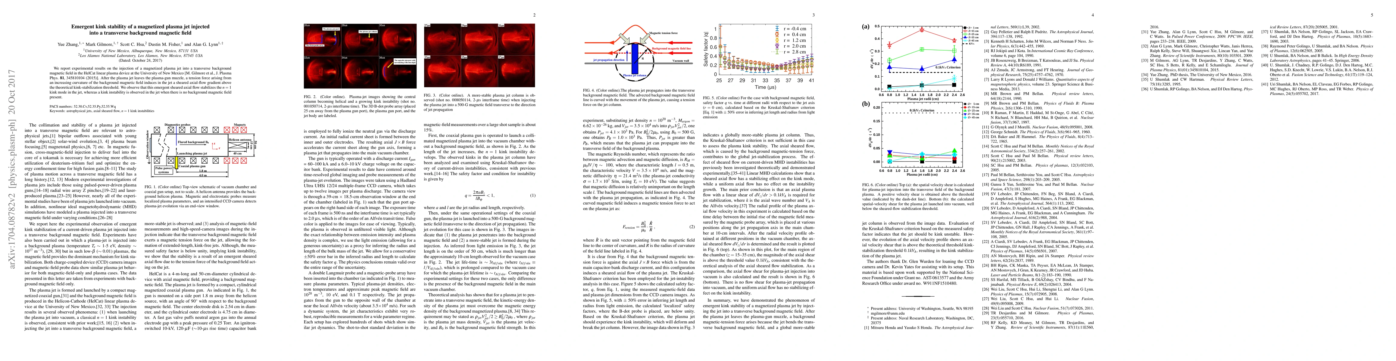 Summary: Experimental results from the HelCat linear plasma device show that a magnetized plasma jet injected into a transverse background magnetic field develops a sheared axial flow, which stabilizes the n=1 kink mode above the theoretical threshold, contrasting with the observed kink instability in the absence of a background magnetic field.
