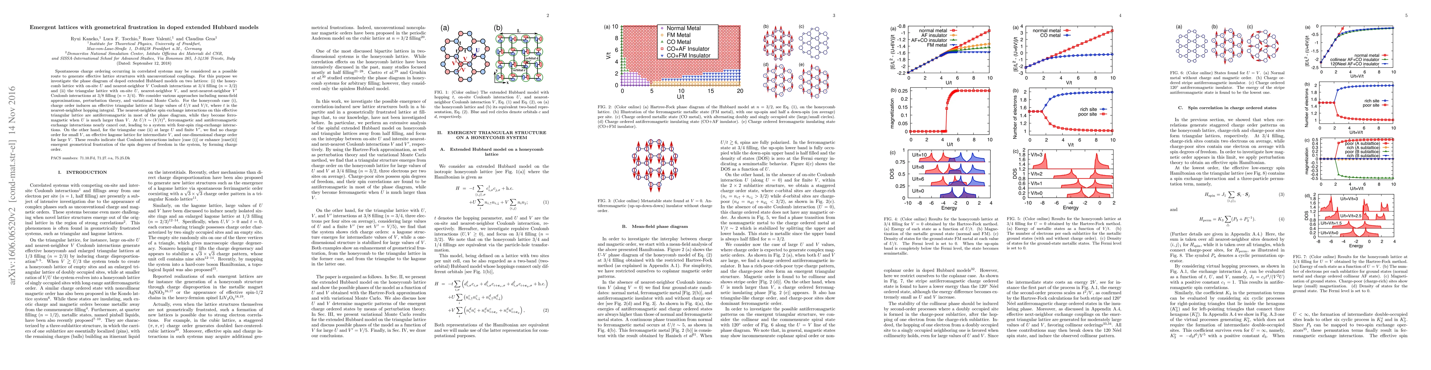 This paper explores the emergent lattice structures and geometrical frustration in doped extended Hubbard models on honeycomb and triangular lattices. It finds that charge ordering induces unconventional couplings and spin interactions, leading to frustration and complex spin dynamics in these correlated systems.