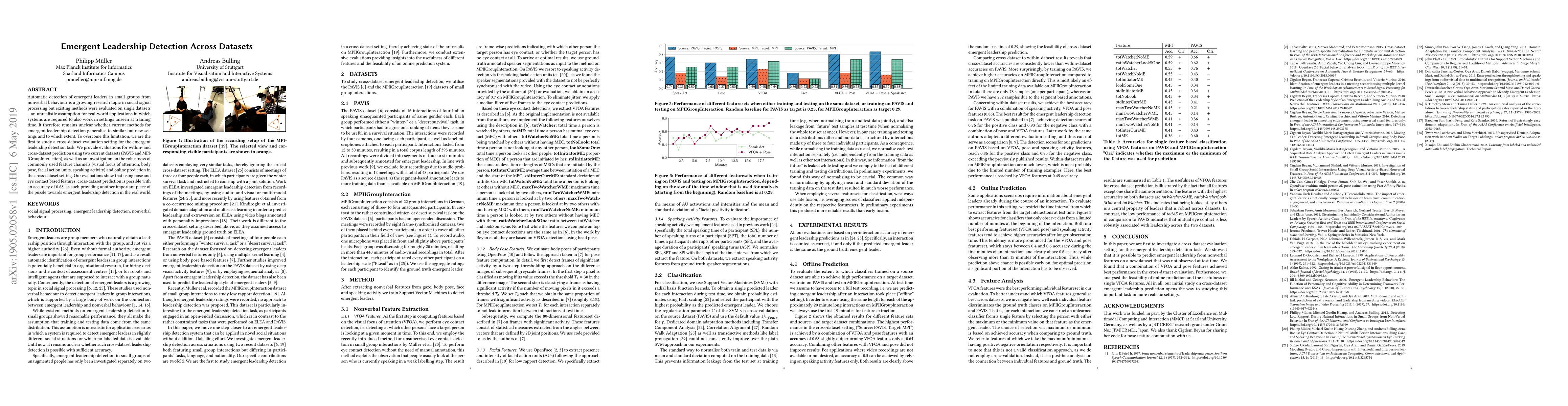 Automatic detection of emergent leaders in small groups from nonverbal behaviour is a growing research topic in social signal processing but existing methods were evaluated on single datasets -- an unrealistic assumption for real-world applications in which systems are required to also work in settings unseen at training time. It therefore remains unclear whether current methods for emergent leadership detection generalise to similar but new settings and to which extent. To overcome this limitation, we are the first to study a cross-dataset evaluation setting for the emergent leadership detection task. We provide evaluations for within- and cross-dataset prediction using two current datasets (PAVIS and MPIIGroupInteraction), as well as an investigation on the robustness of commonly used feature channels (visual focus of attention, body pose, facial action units, speaking activity) and online prediction in the cross-dataset setting. Our evaluations show that using pose and eye contact based features, cross-dataset prediction is possible with an accuracy of 0.68, as such providing another important piece of the puzzle towards emergent leadership detection in the real world.