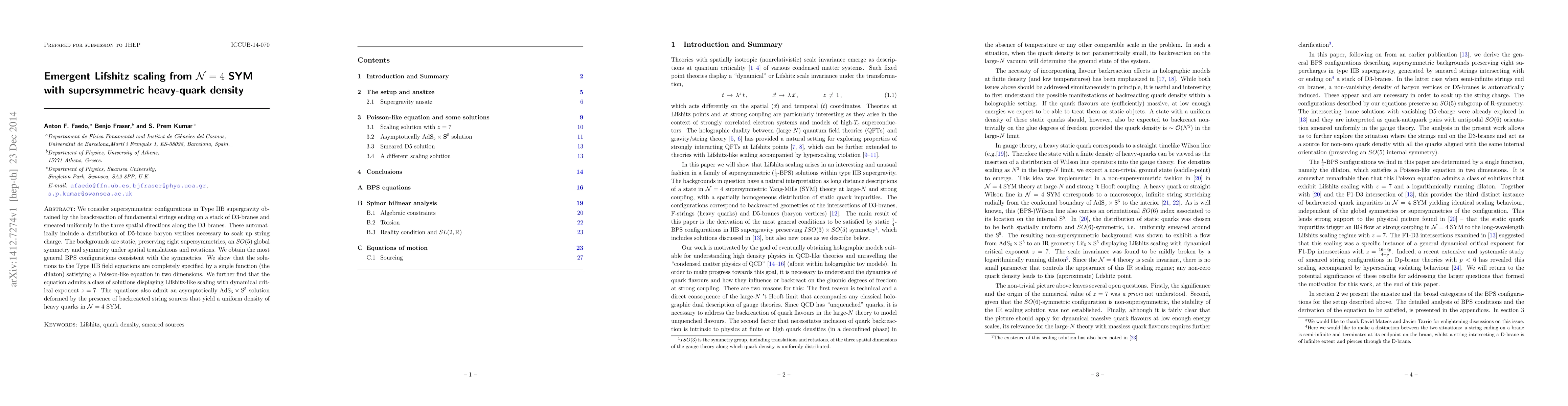 We consider supersymmetric configurations in Type IIB supergravity obtained by the beackreaction of fundamental strings ending on a stack of D3-branes and smeared uniformly in the three spatial directions along the D3-branes. These automatically include a distribution of D5-brane baryon vertices necessary to soak up string charge. The backgrounds are static, preserving eight supersymmetries, an SO(5) global symmetry and symmetry under spatial translations and rotations. We obtain the most general BPS configurations consistent with the symmetries. We show that the solutions to the Type IIB field equations are completely specified by a single function (the dilaton) satisfying a Poisson-like equation in two dimensions. We further find that the equation admits a class of solutions displaying Lifshitz-like scaling with dynamical critical exponent z=7. The equations also admit an asymptotically AdS_5 x S^5 solution deformed by the presence of backreacted string sources that yield a uniform density of heavy quarks in N=4 SYM.