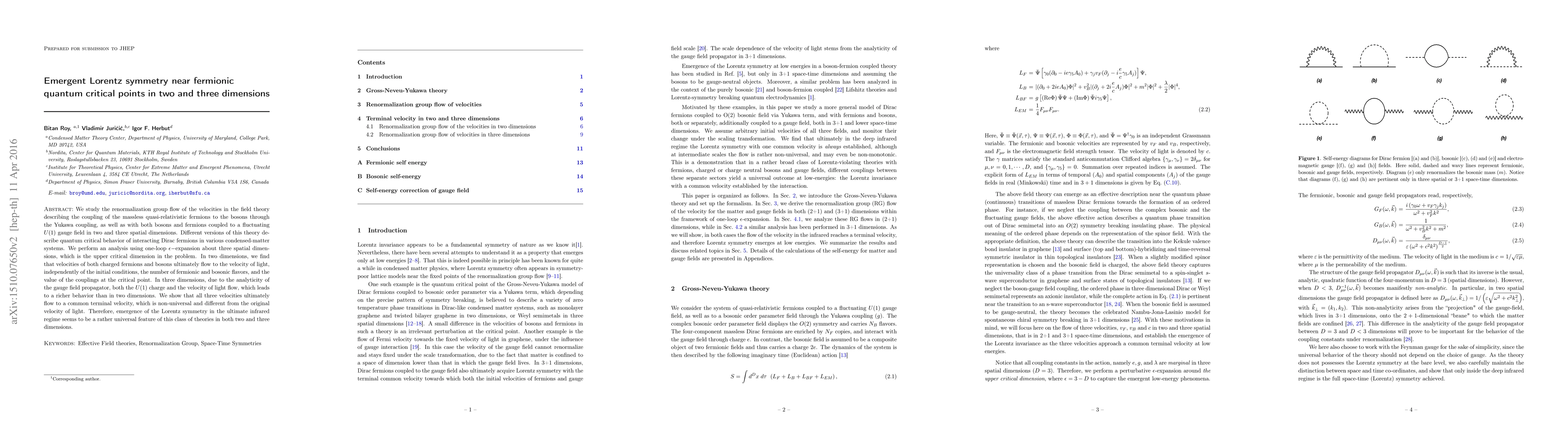 We study the renormalization group flow of the velocities in the field theory describing the coupling of the massless quasi-relativistic fermions to the bosons through the Yukawa coupling, as well as with both bosons and fermions coupled to a fluctuating $U(1)$ gauge field in two and three spatial dimensions. Different versions of this theory describe quantum critical behavior of interacting Dirac fermions in various condensed-matter systems. We perform an analysis using one-loop $\epsilon-$expansion about three spatial dimensions, which is the upper critical dimension in the problem. In two dimensions, we find that velocities of both charged fermions and bosons ultimately flow to the velocity of light, independently of the initial conditions, the number of fermionic and bosonic flavors, and the value of the couplings at the critical point. In three dimensions, due to the analyticity of the gauge field propagator, both the $U(1)$ charge and the velocity of light flow, which leads to a richer behavior than in two dimensions. We show that all three velocities ultimately flow to a common terminal velocity, which is non-universal and different from the original velocity of light. Therefore, emergence of the Lorentz symmetry in the ultimate infrared regime seems to be a rather universal feature of this class of theories in both two and three dimensions.