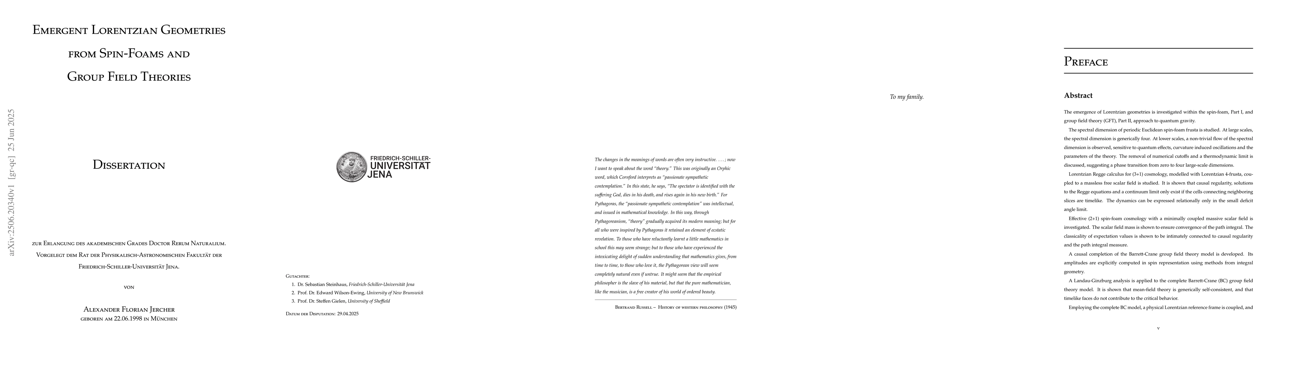 This research explores the emergence of Lorentzian geometries from spin-foams and group field theories, demonstrating that spectral dimension analysis reveals a flow sensitive to quantum effects. It establishes conditions for causal regularity in Lorentzian Regge calculus and investigates effective cosmology models. The study also presents a causal completion of the Barrett-Crane group field theory, analyzing its critical behavior and extracting scalar cosmological perturbations from entangled GFT coherent states, aligning with classical results up to quantum corrections.