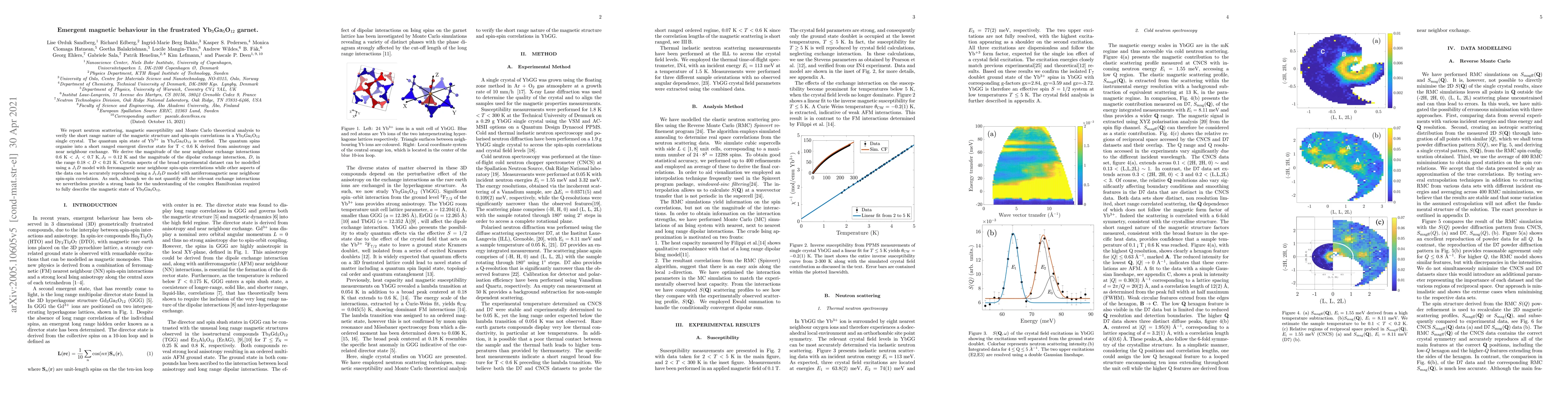 This study investigates the emergent magnetic behavior in Yb$_3$Ga$_5$O$_{12}$ using neutron scattering and theoretical analysis, revealing a short-range quantum spin state and a director state below 0.4 K. The research identifies key exchange interactions and models the magnetic structure with both ferromagnetic and antiferromagnetic correlations.