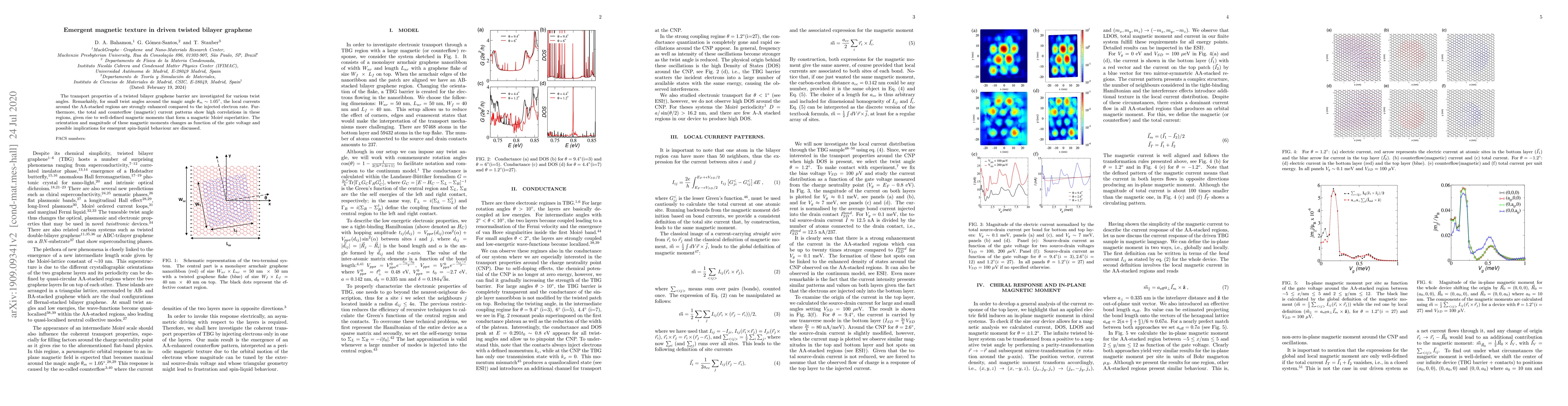This study reveals that twisted bilayer graphene at small twist angles near the magic angle exhibits enhanced local currents and correlated magnetic moments forming a magnetic Moir\'e superlattice, with properties influenced by gate voltage, suggesting potential for emergent spin-liquid behavior.