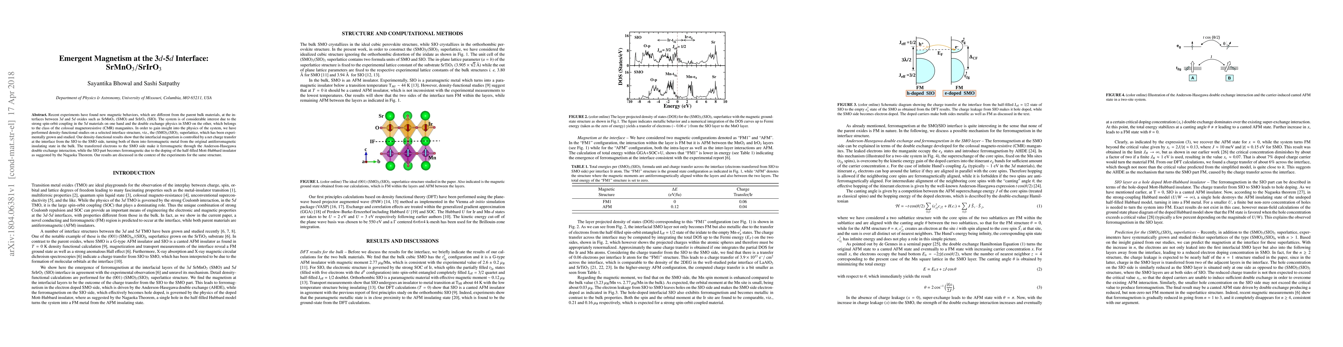 Recent experiments have found new magnetic behaviors, which are different from the parent bulk materials, at the interfaces between 3$d$ and 5$d$ oxides such as SrMnO$_3$ (SMO) and SrIrO$_3$ (SIO). The system is of considerable interest due to the strong spin-orbit coupling in the 5$d$ materials on one hand and the double exchange physics in SMO on the other, which belongs to the class of the colossal magnetoresistive (CMR) manganites. In order to gain insight into the physics of the system, we have performed density-functional studies on a selected interface structure, viz., the (SMO)$_1$(SIO)$_1$ superlattice, which has been experimentally grown and studied. Our density-functional results show that the interfacial magnetism is controlled by a net charge transfer at the interface from the SIO to the SMO side, turning both of them into ferromagnetic metal from the original antiferromagnetic insulating state in the bulk. The transferred electrons to the SMO side make it ferromagnetic through the Anderson-Hasegawa double exchange interaction, while the SIO part becomes ferromagnetic due to the doping of the half-filled Mott-Hubbard insulator as suggested by the Nagaoka Theorem. Our results are discussed in the context of the experiments for the same structure.