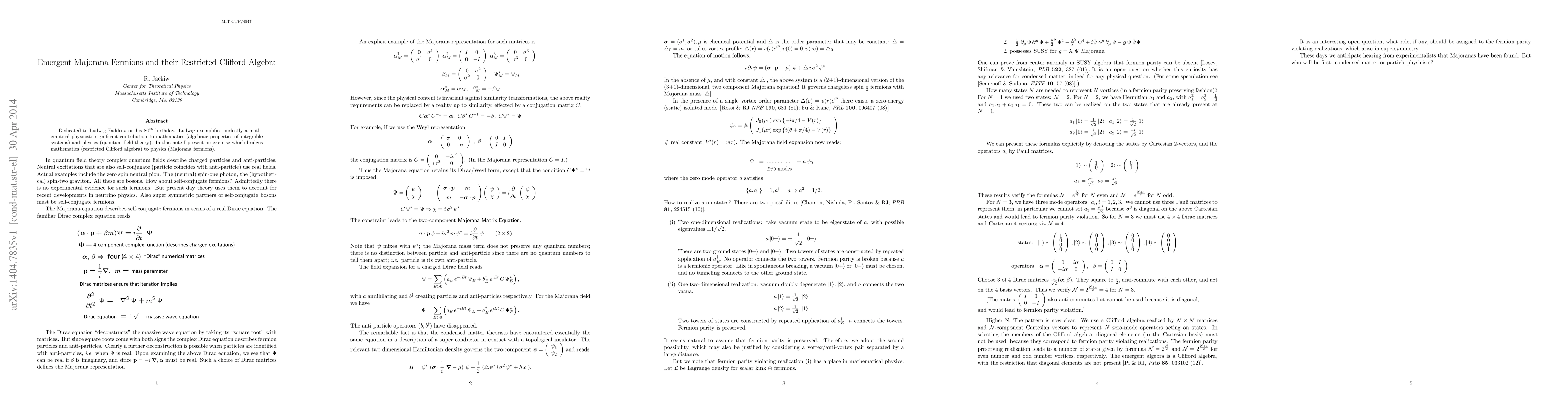 Dedicated to Ludwig Faddeev on his 80th birthday. Ludwig exemplifies perfectly a mathematical physicist: significant contribution to mathematics (algebraic properties of integrable systems) and physics (quantum field theory). In this note I present an exercise which bridges mathematics (restricted Clifford algebra) to physics (Majorana fermions).