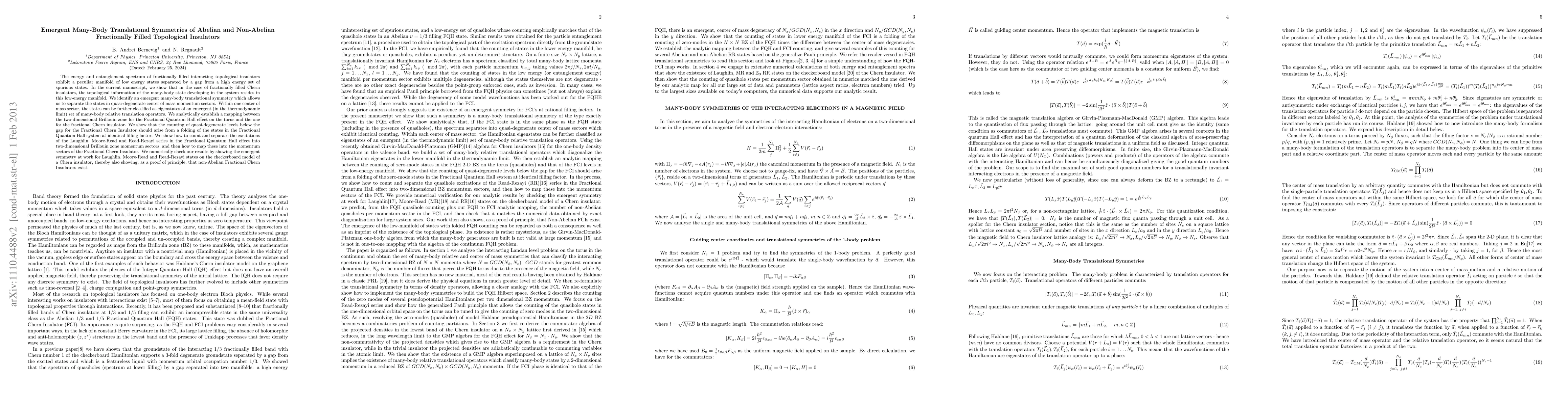 This research paper reveals an emergent many-body translational symmetry in fractionally filled topological insulators, enabling the separation of low-energy states into quasi-degenerate center of mass momentum sectors.